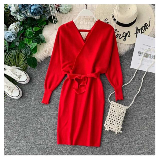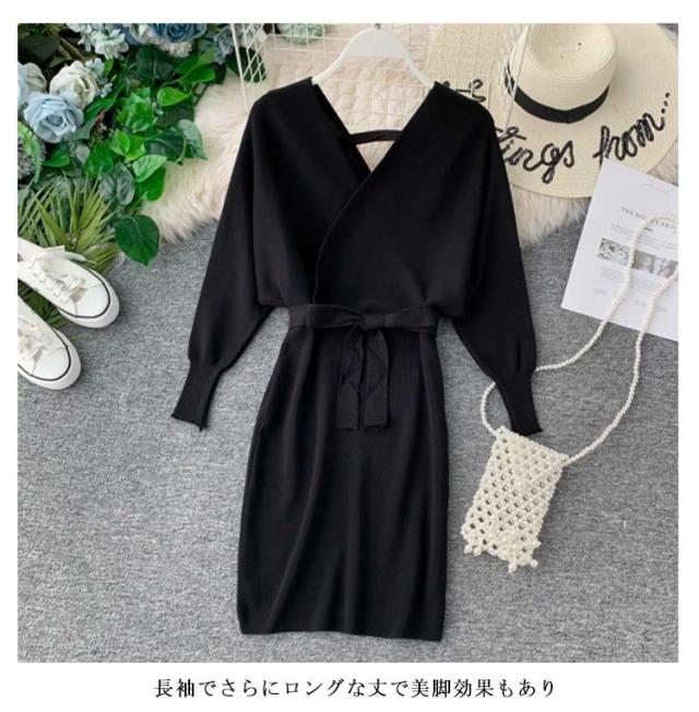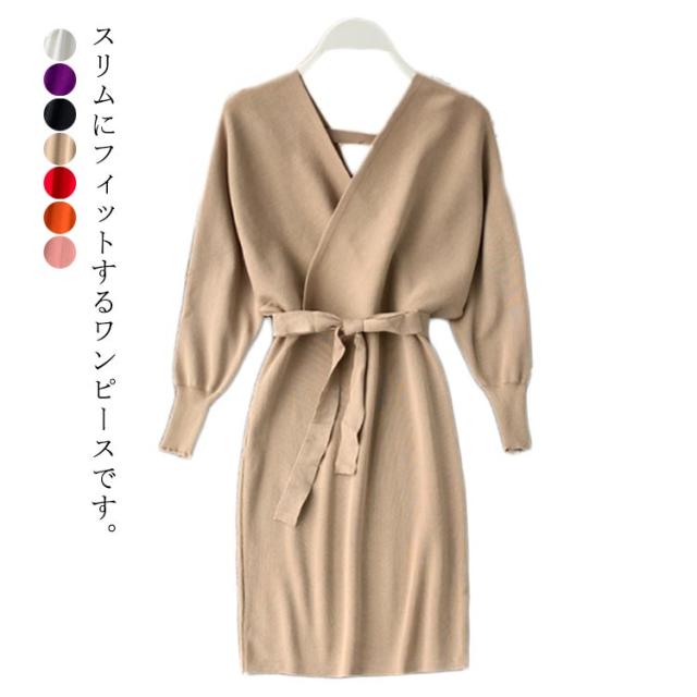 タイトリブニットワンピース ロングニットワンピース Vネック 長袖 ニットワンピース ロング スリット タイト ひざたけ 膝丈 ロング丈 秋冬 春秋 ニット ワンピース セクシー タイトワンピース 送料無料