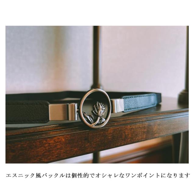 | シンプルなデザインで使いやすく印象的☆ エスニック風バックルは個性的でオシャレなワンポイントになります サイズ調整(ゴム仕様)も自由自在でしっかり締めて使いやすいファッションベルトです | |