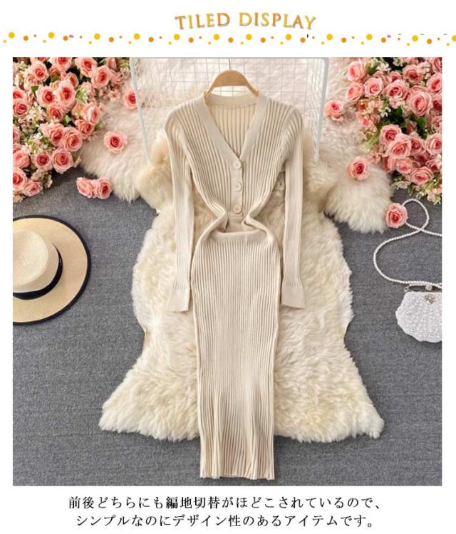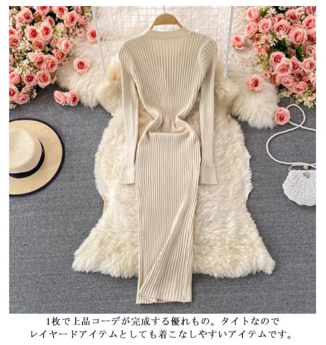 タイトニットワンピース タイトニット タイトワンピース ロングニットワンピース Vネック 長袖 リブ ニットワンピース ロング丈 タイト ひざたけ 膝丈 秋冬 春秋 ニット 無地 シンプル