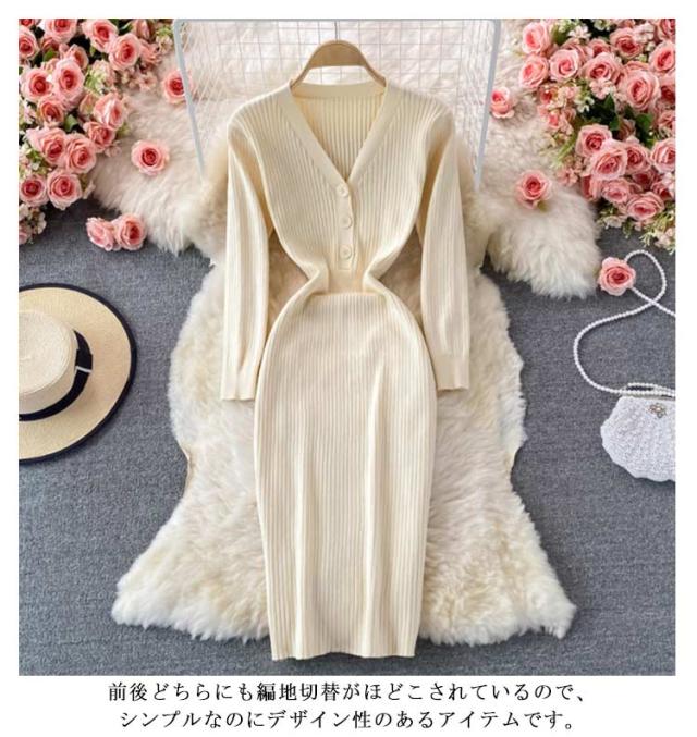 タイトニットワンピース タイトニット タイトワンピース ロングニットワンピース Vネック 長袖 リブ ニットワンピース ロング丈 タイト ひざたけ 膝丈 秋冬 春秋 ニット 無地 シンプル