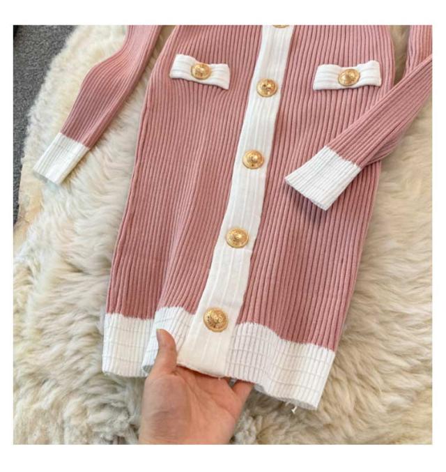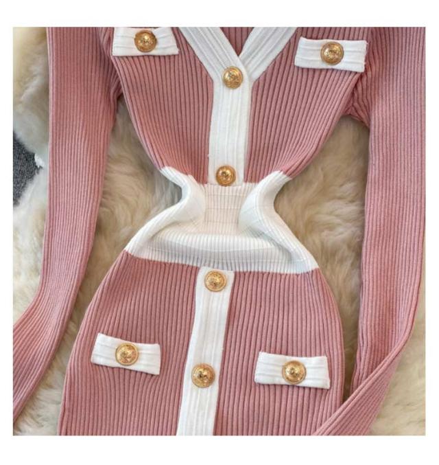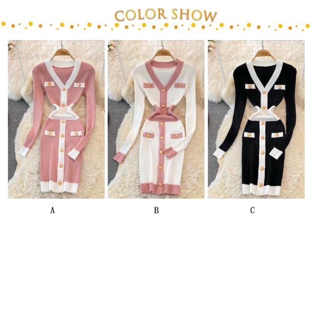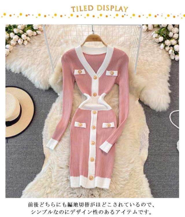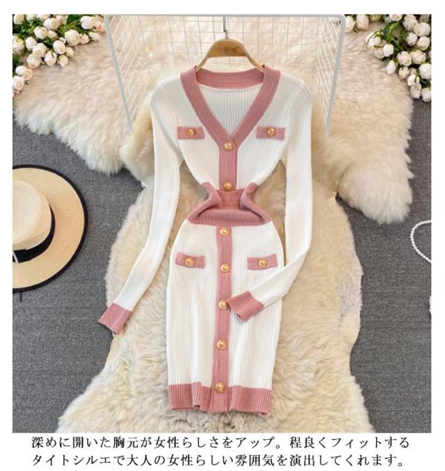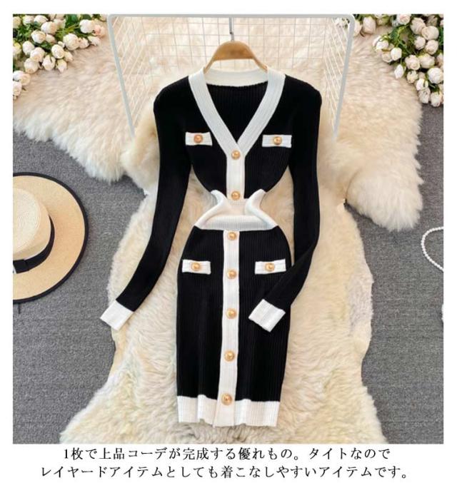 タイトニットワンピース タイトニット タイトワンピース ロングニットワンピース Vネック 長袖 リブ ニットワンピース ロング丈 タイト ひざたけ 膝丈 秋冬 春秋 ニット 無地 シンプル