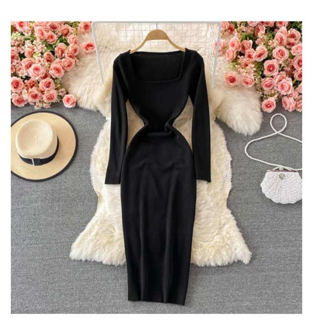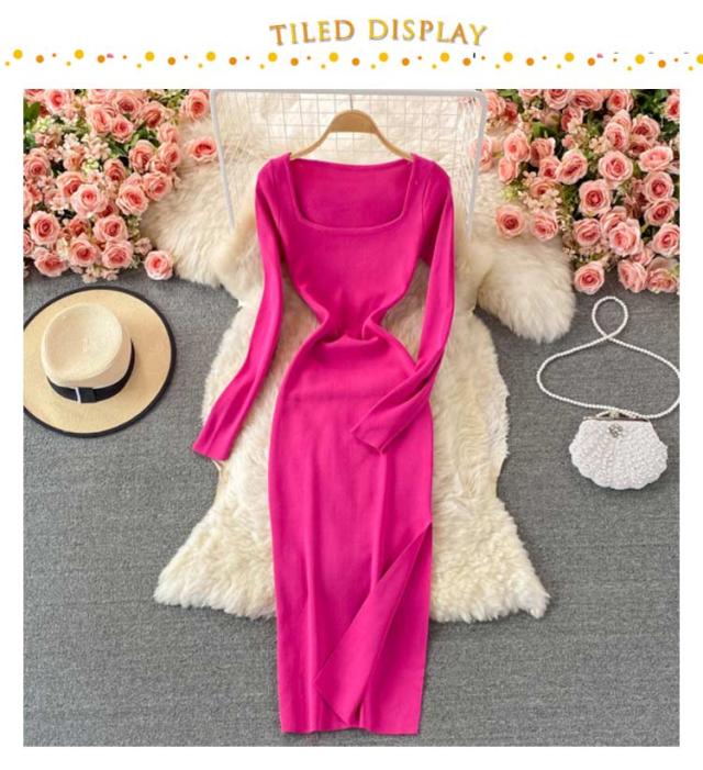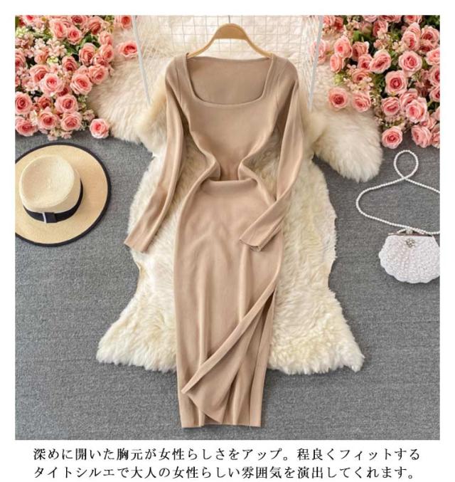 タイトニットワンピース タイトニット タイトワンピース ロングニットワンピース スリット スクェアネック 長袖 ニットワンピース ロング丈 タイト ひざたけ 膝丈 秋冬 春秋 ニット 無地 シンプル