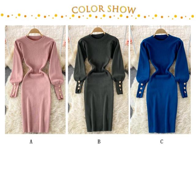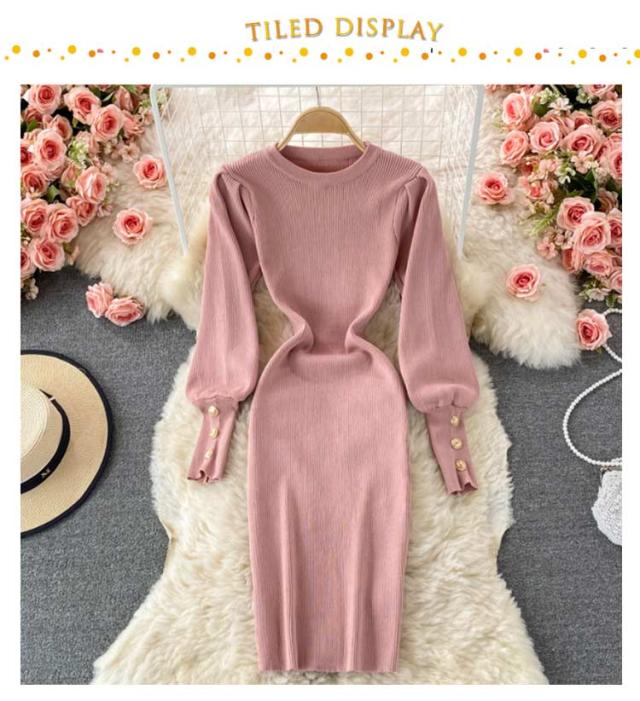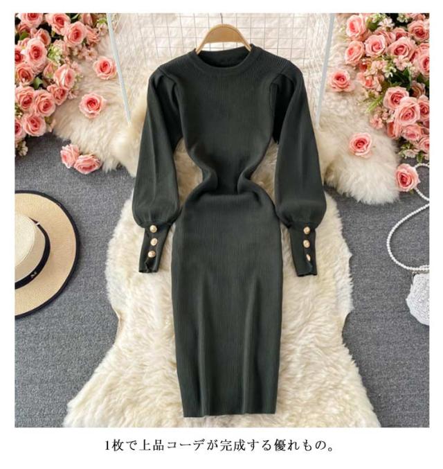 タイトニットワンピース タイトニット パフスリーブ タイトワンピース ロングニットワンピース ランドネック 長袖 リブ ニットワンピース ロング丈 タイト ひざたけ 膝丈 秋冬 春秋 ニット 無地 切替 シンプル