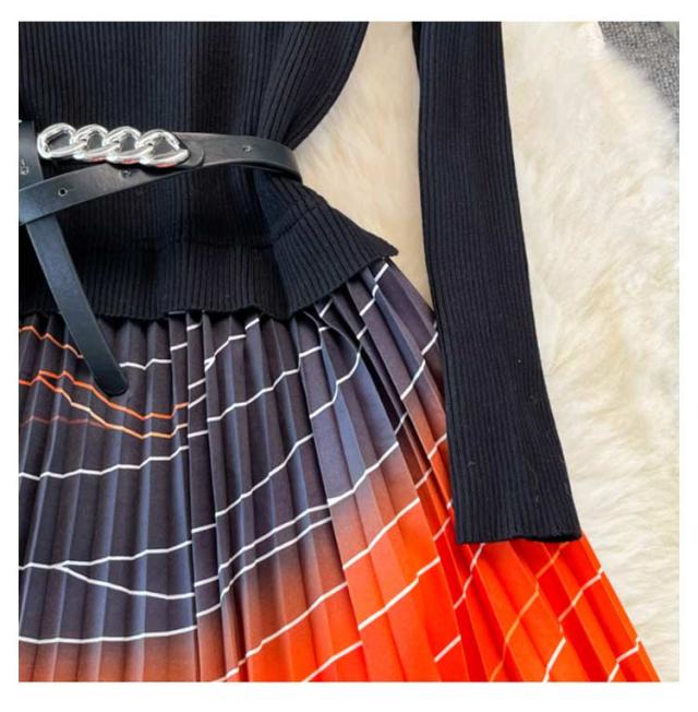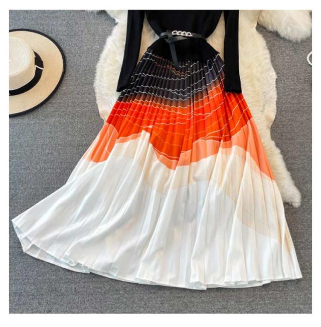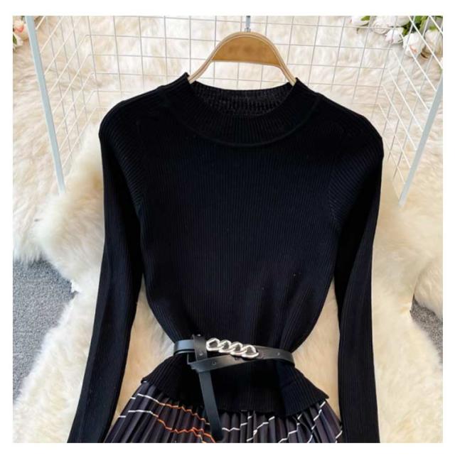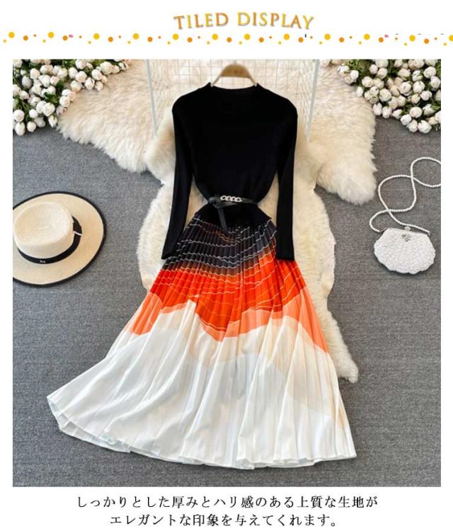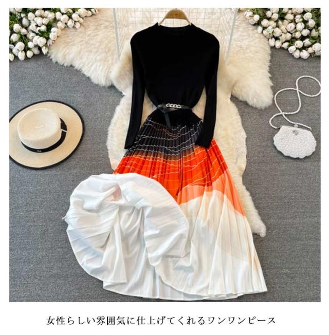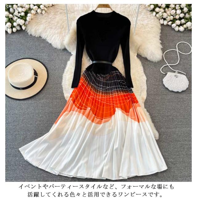 ワンピース ニット 長袖 ニットワンピ 送料無料 無地 ランドネック 春 秋 冬 ロング丈 ミモレ丈 ニット プリールワンピース フレアワンピース エレガント シンプル 切替 バイカラー 配色
