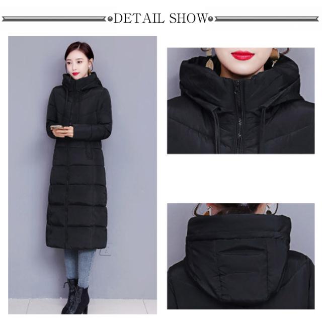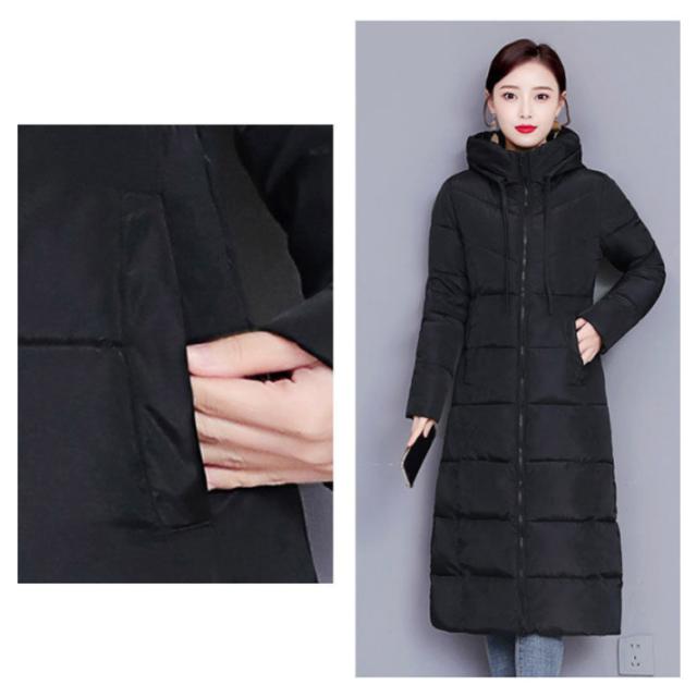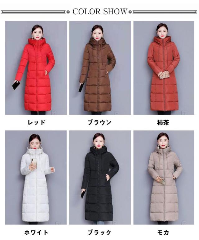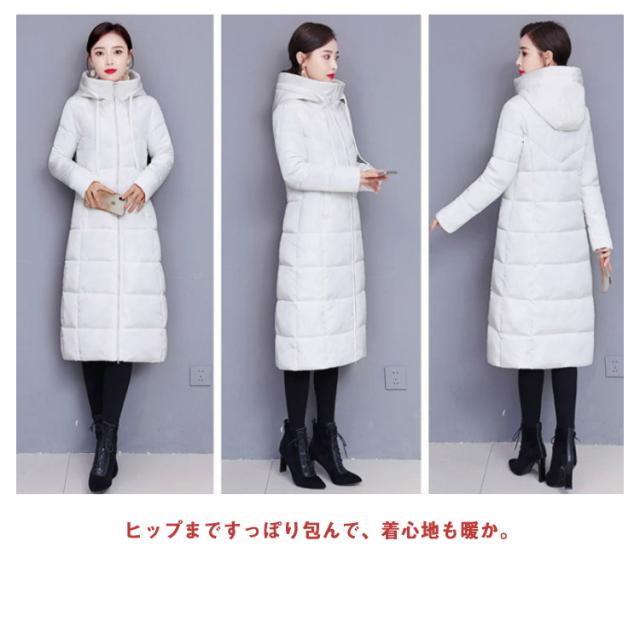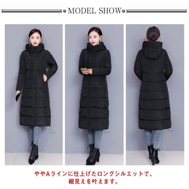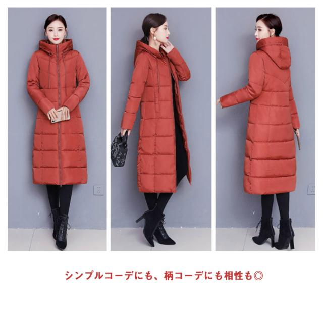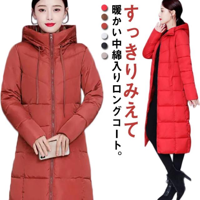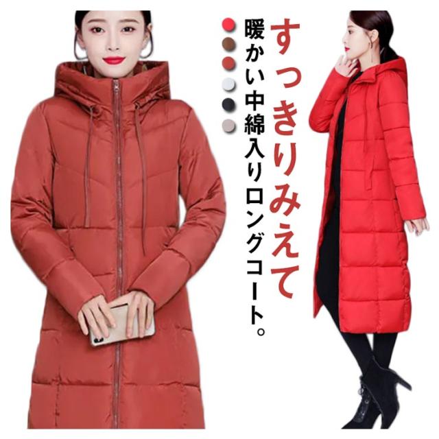中綿コート レディース ロング丈 長袖 ファスナー フード付き ポケット付き 体型カバー アウター 防寒 暖かい カジュアル きれいめ 通勤 通学 女性 冬 無地 全6色