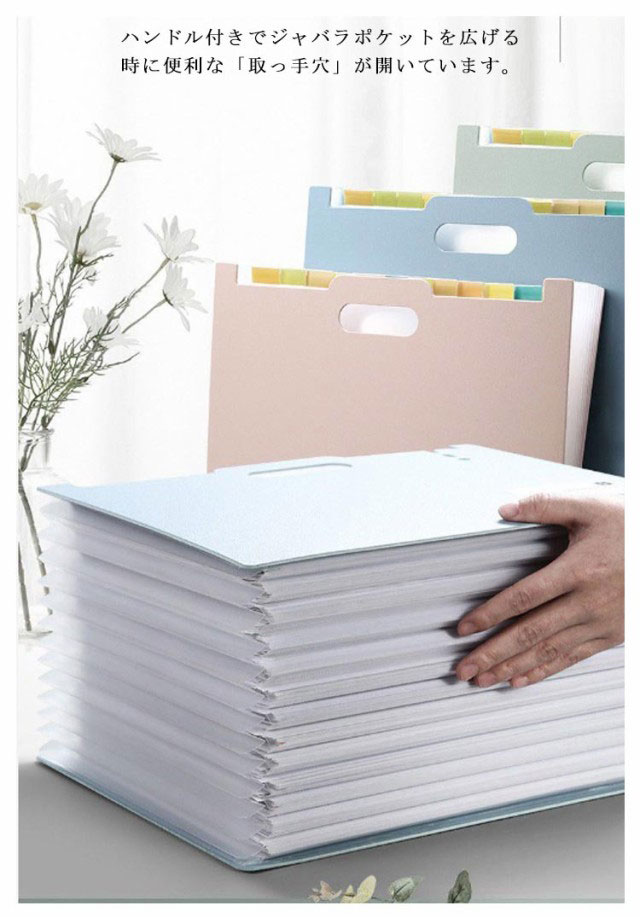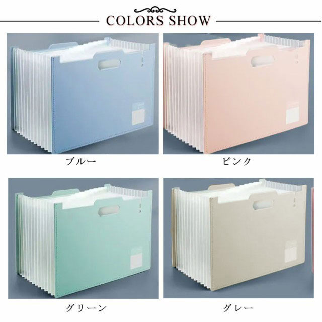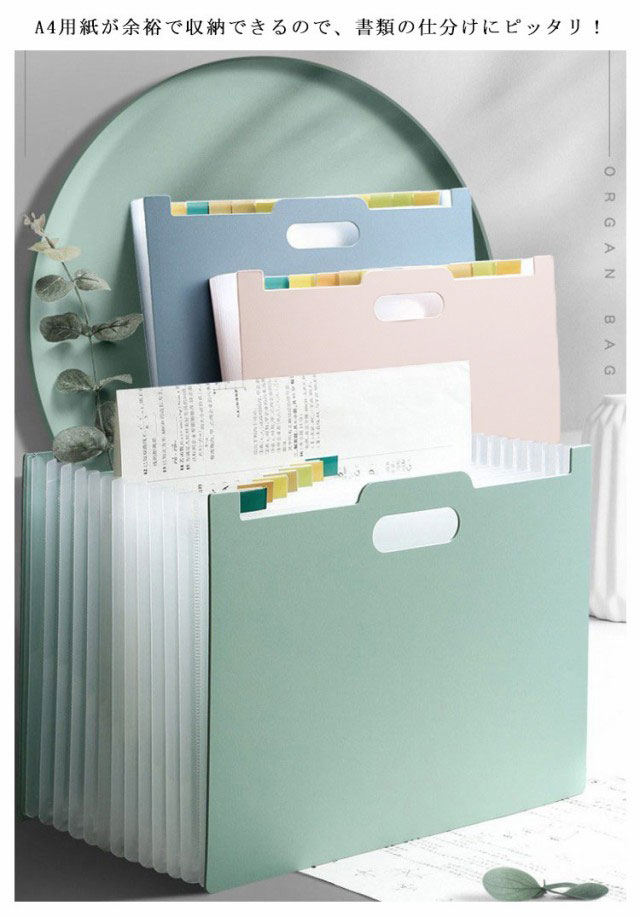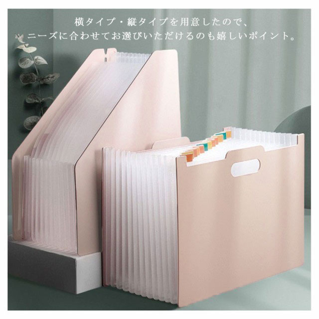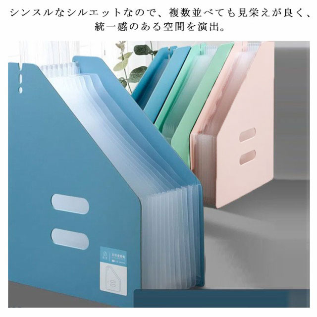 | アコーディオン式ドキュメントスタンド、伸縮自在! A4用紙が余裕で収納できるので、書類の仕分けにピッタリ! ハンドル付きでジャバラポケットを広げる時に便利な「取っ手穴」が開いています。 横タイプ・縦タイプを用意したので、ニーズに合わせてお選びいただけるのも嬉しいポイント。 防水のPP素材を採用するので、水濡れ心配もありません。 シンスルなシルエットなので、複数並べても見栄えが良く、統一感のある空間を演出。 | |