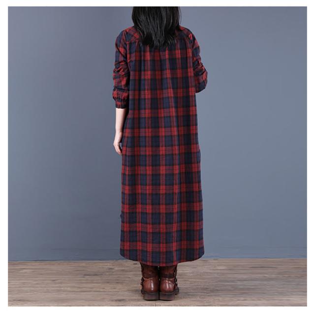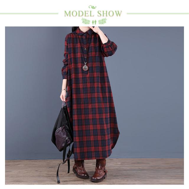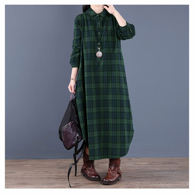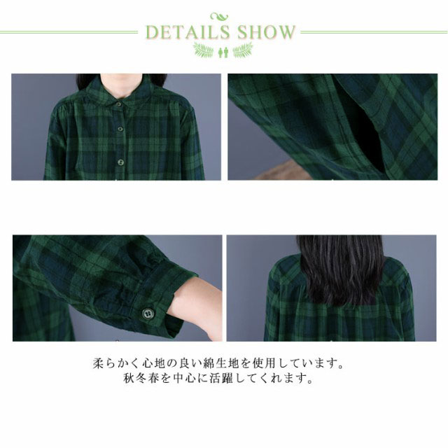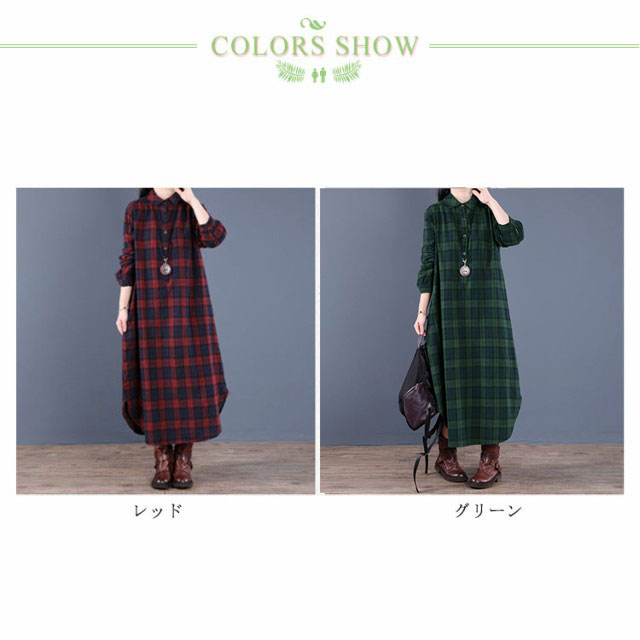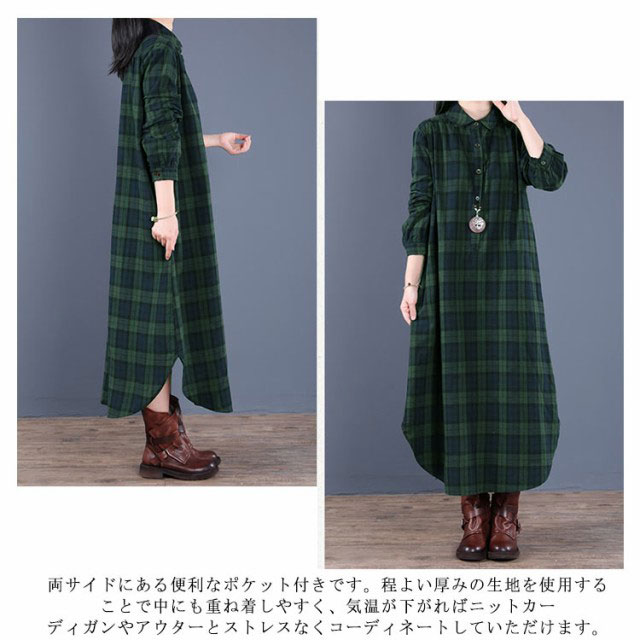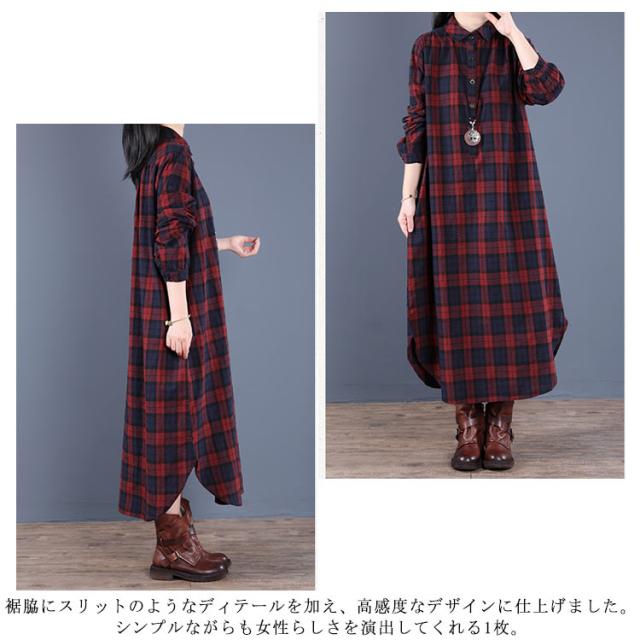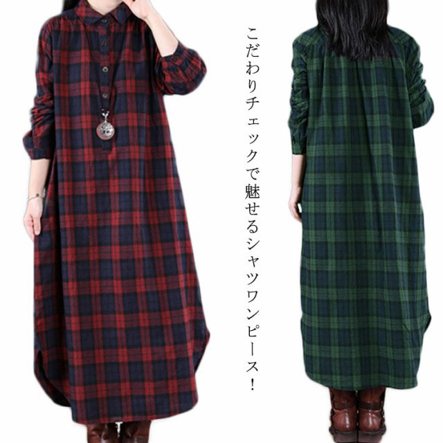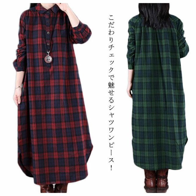 ワンピース レディース チェックワンピース ロング マキシ丈 女子トップス 女性 シャツワンピース レディースチュニック 長袖 プルオーバー チェック 着痩せ ゆったり 着心地良い Aライン 体型カバー 秋 冬
