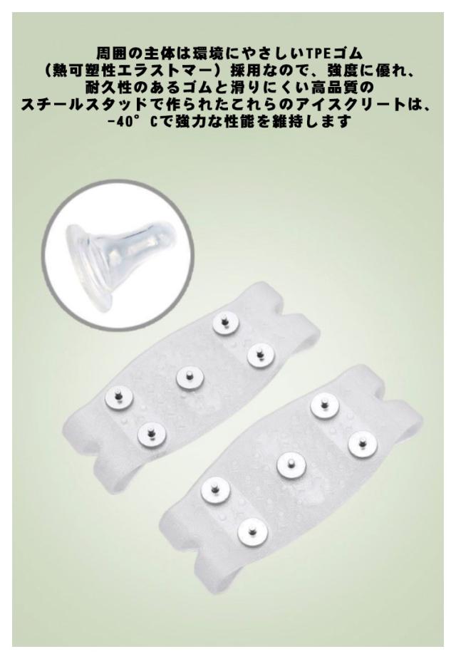 | ?【耐用素材】周囲の主体は環境にやさしいTPEゴム(熱可塑性エラストマー)採用なので、強度に優れ、耐久性のあるゴムと滑りにくい高品質のスチールスタッドで作られたこれらのアイスクリートは、-40°Cで強力な性能を維持します。 ?【より安全で耐久性&転倒を防ぐ設計】:5つのスチールスパイクが取り付けられているため、これらのアイゼンアイスクリートは雪や氷の状態で優れたグリップを提供し、滑りや転倒のリスクを軽減します。 ?【多種靴対応】:伸縮性よいから、スニーカー、革靴、ブーツ、ビジネスシューズ、長靴などに最適です。釣り、狩猟、ウォーキング、ジョギング、ハイキング、ランニング、スノーショーなどに最適です。アウトドア活動を随分楽しむことができる。靴サイズは写真5ご参考下さい。 | |