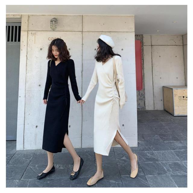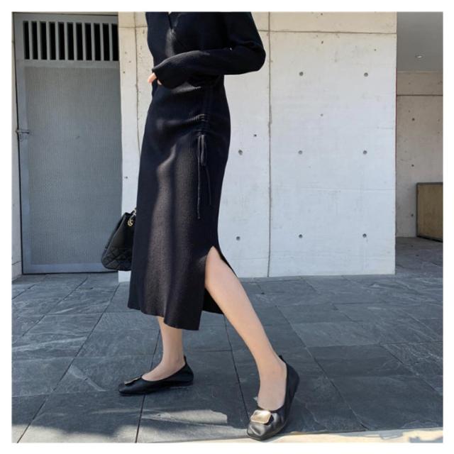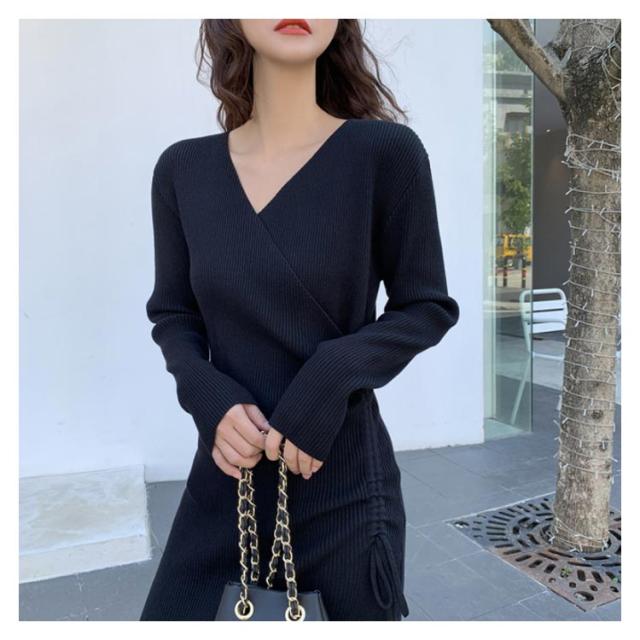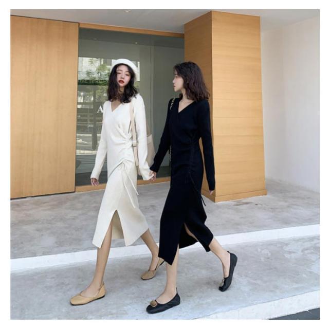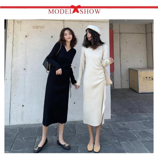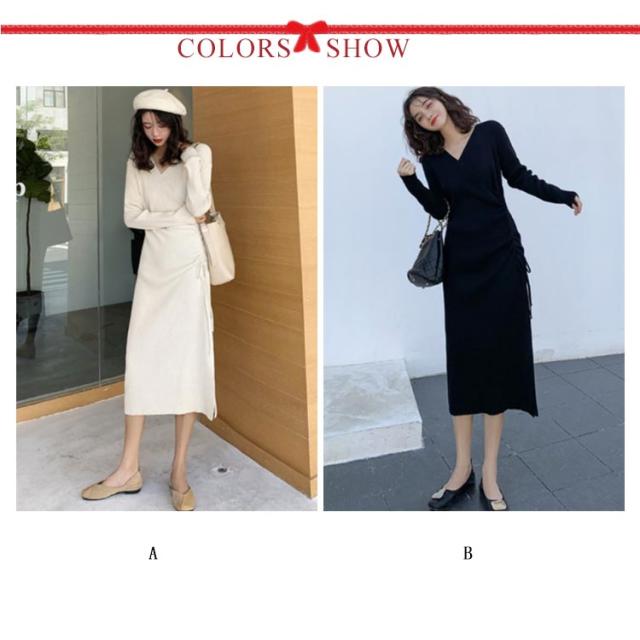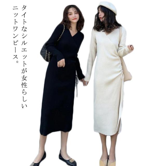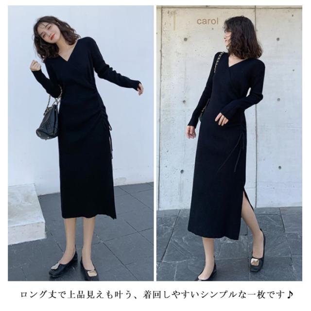 リブニット ワンピース ニットワンピース リブワンピ タイトワンピース スリット入り Vネック ロングワンピ 長袖 ウエスト紐 きれいめ カジュアル ロング丈 おしゃれ レディース 可愛い タイト ドレス 20代 30代 40代 50代