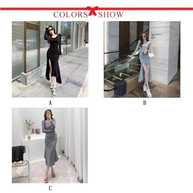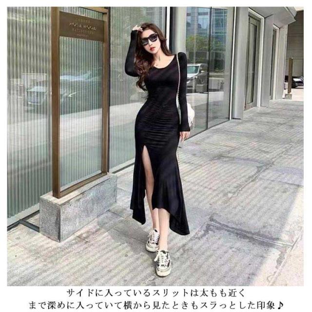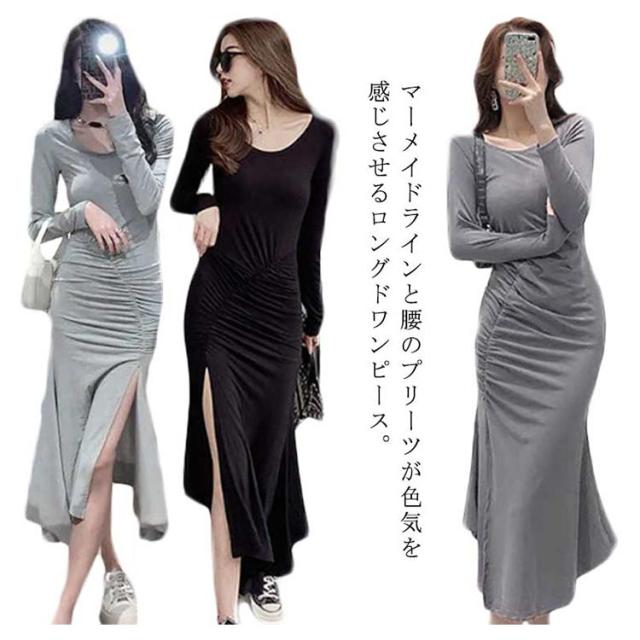 マーメイドスカート マーメイドワンピース 長袖 スリット入り タイトワンピース フレアワンピース ロングワンピース ロングワンピ aラインワンピース ブラック 黒 グレー 灰