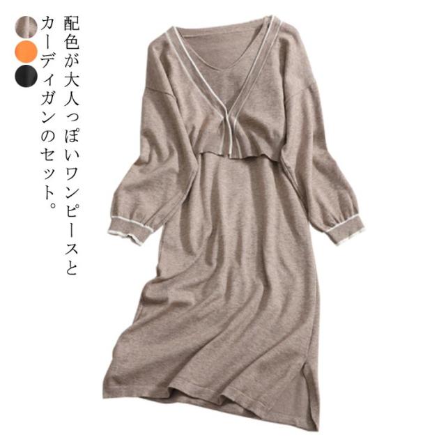2点セット セットアップ ニットワンピース ニットカーディガン 長袖 Vネック キャミソールワンピース レディース ニットワンピース 柔らかい 着心地 暖かい 上品 通勤 普段着 お洒落 謝恩会 披露宴 同窓会 女子会 結婚式