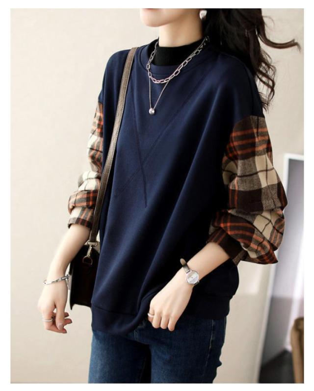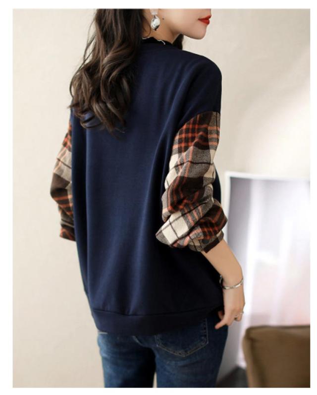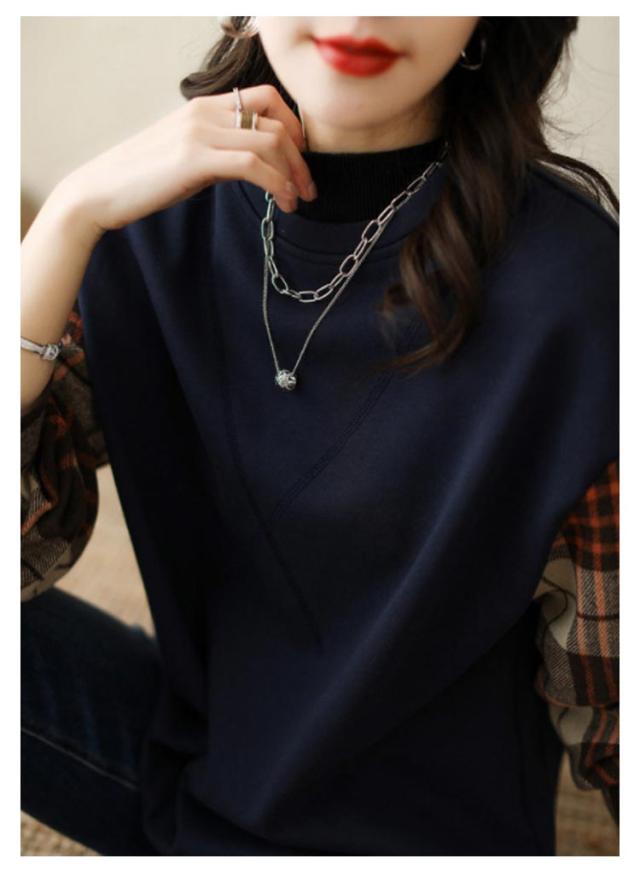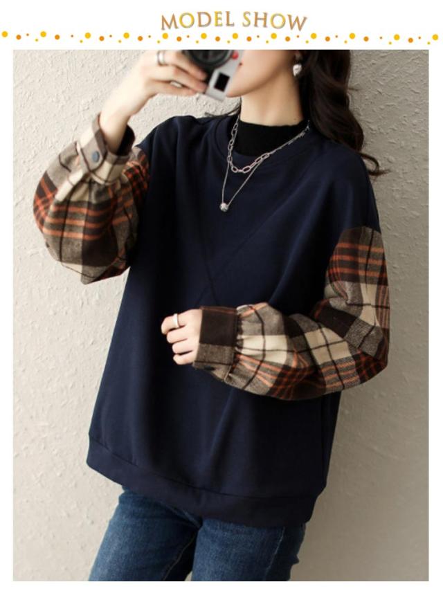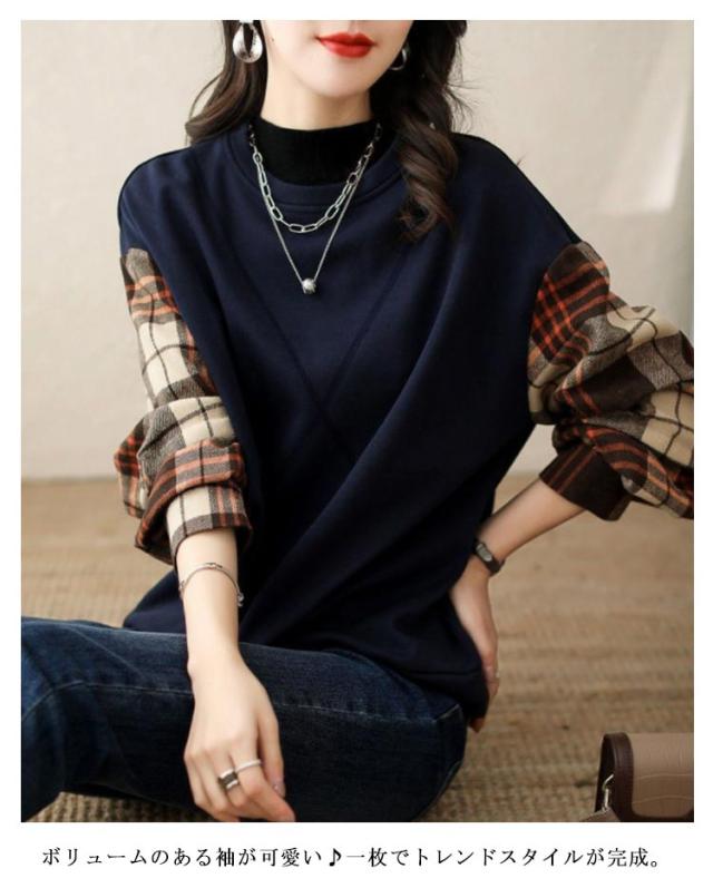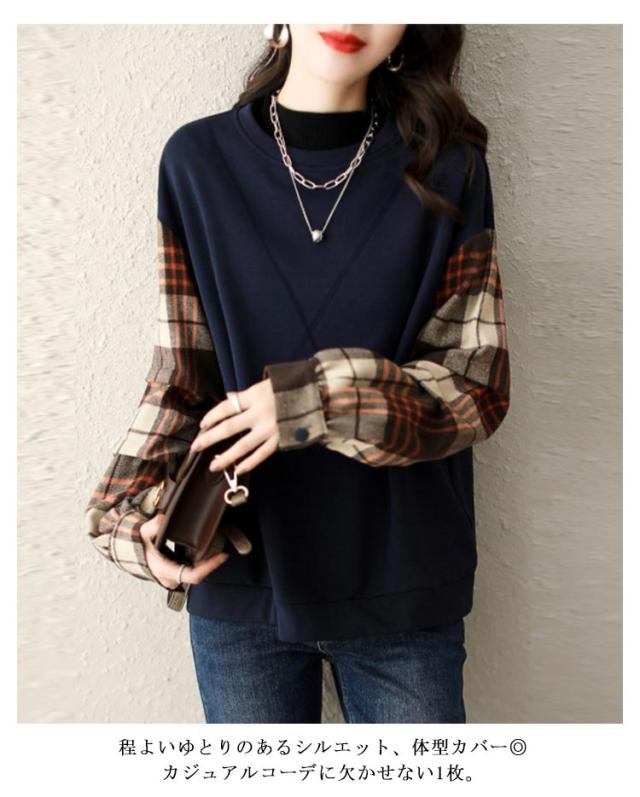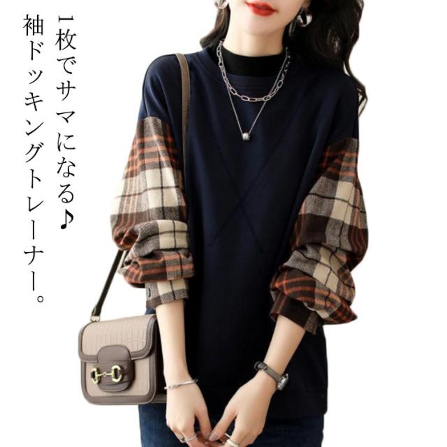 トレーナー スウェット トップス 袖切り替え 重ね着風 フェイクレイヤード レディース 長袖 トップス チェック柄 送料無料 シャツ袖 シャツ切り替え ゆったり 体型カバー 大きいサイズ 春新作 秋 30代 40代