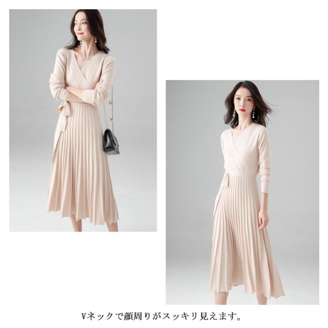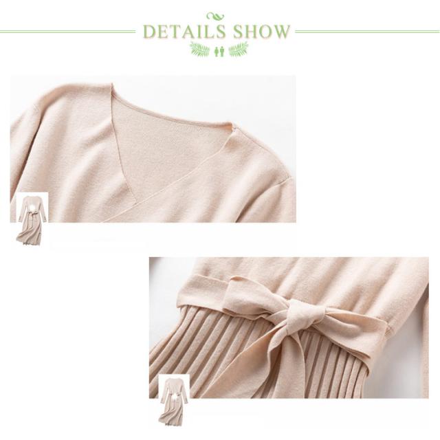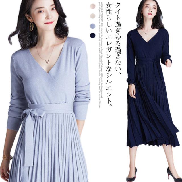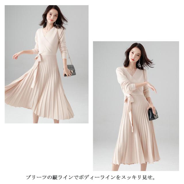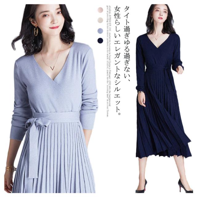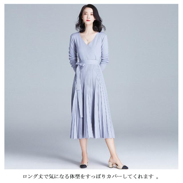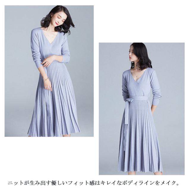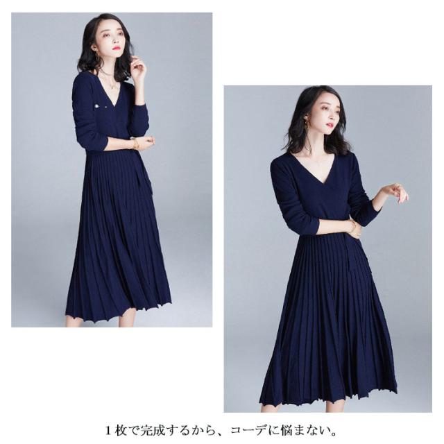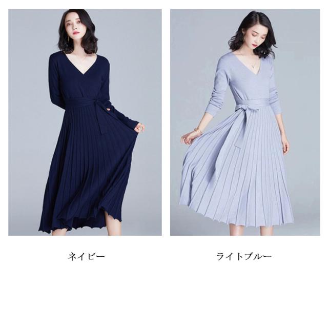 ニット ワンピース Vネック ロングワンピース プリーツ 長袖 ひざ下 ウエストリボン プリーツ ミモレ丈 細見え オフィス 春 秋 冬 マタニティ 体型カバー 無地 シンプル オフィス 脚長効果