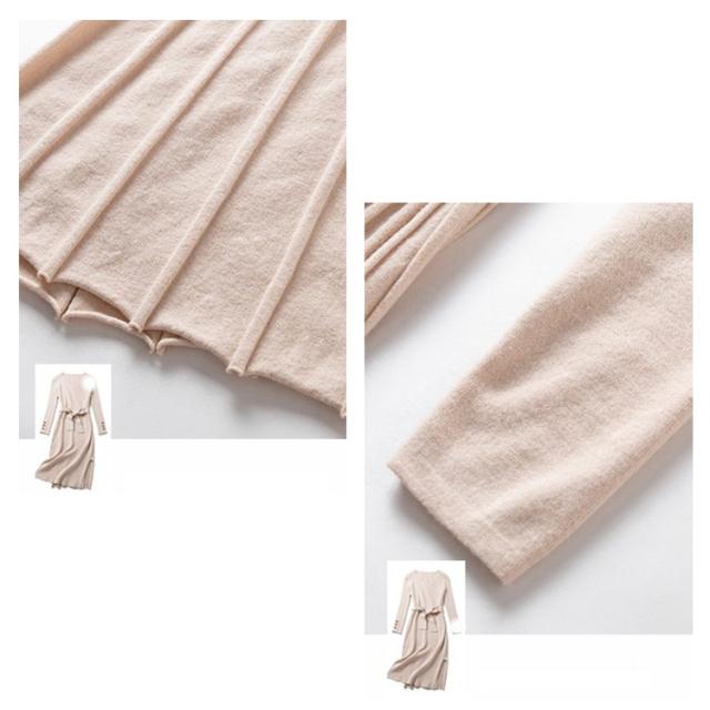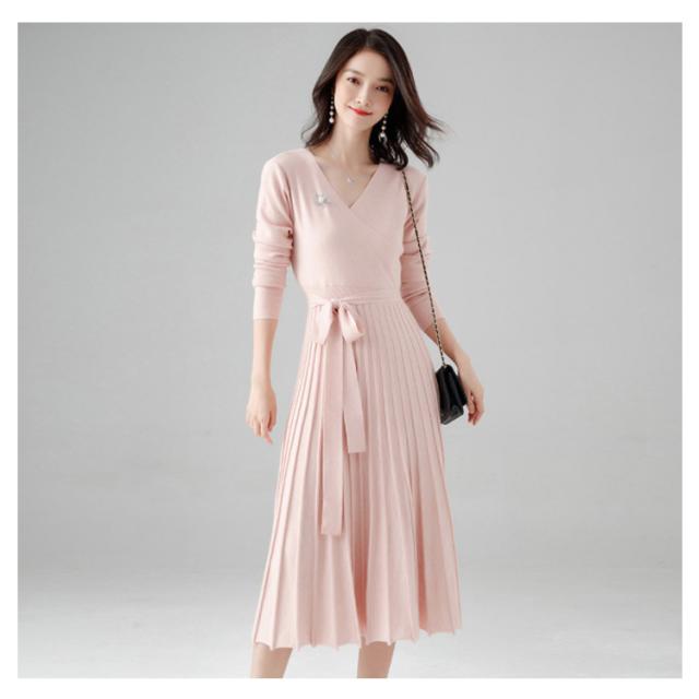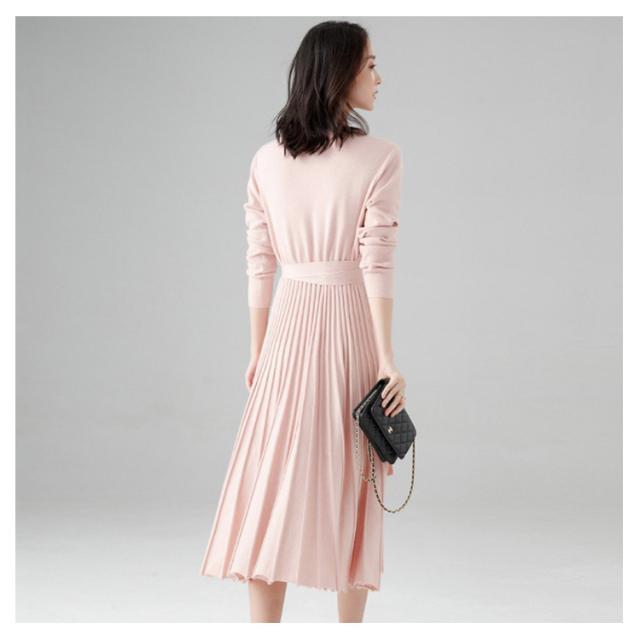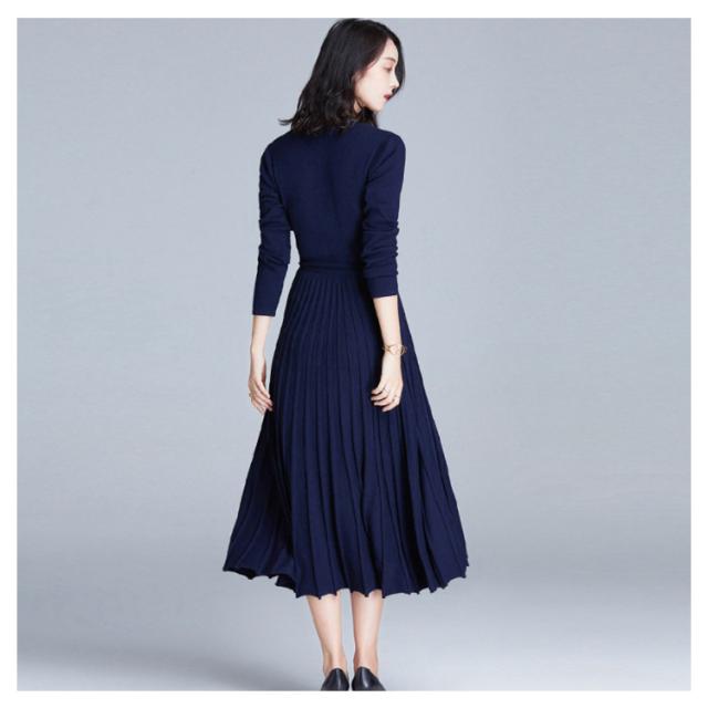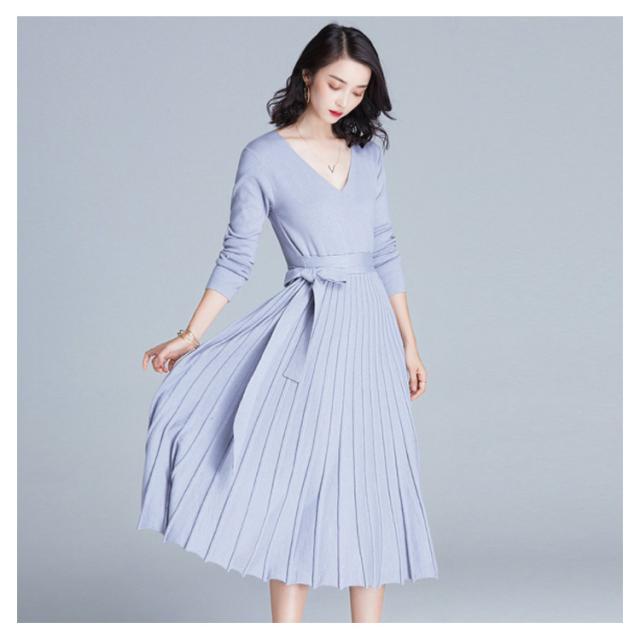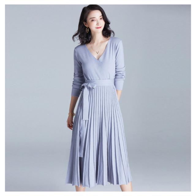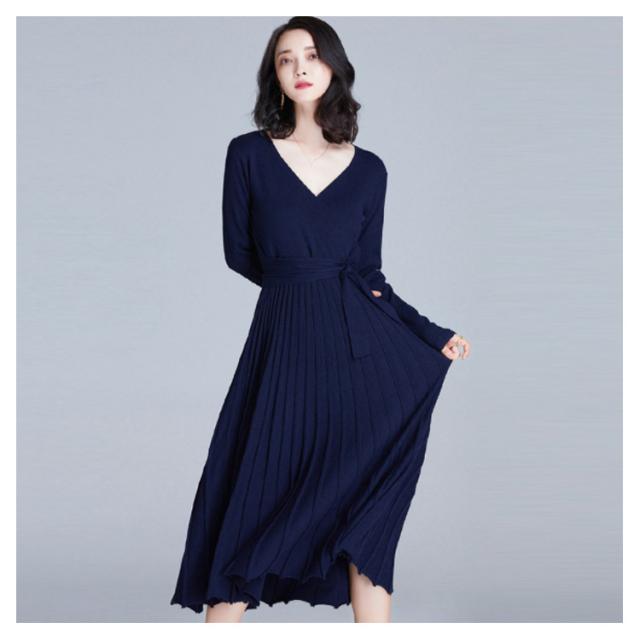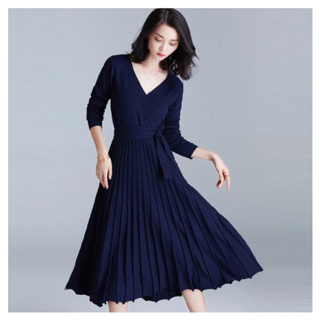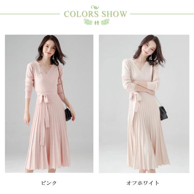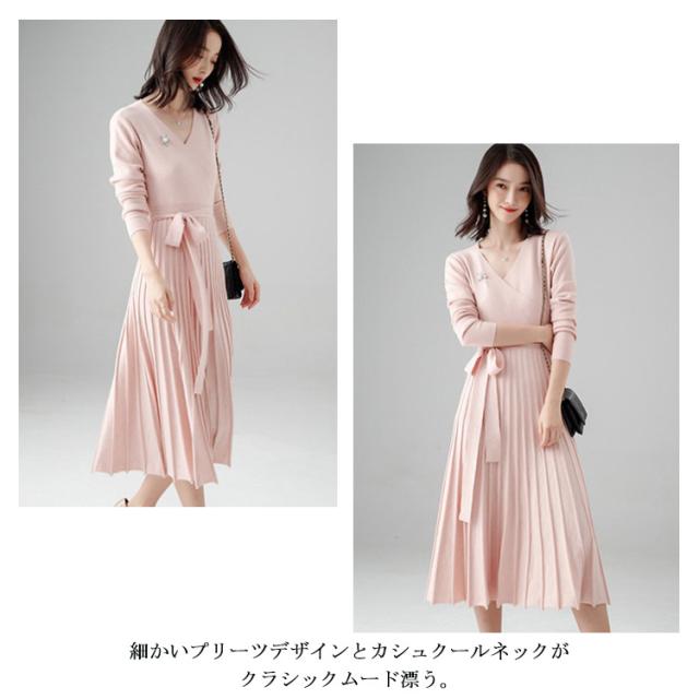 ニット ワンピース Vネック ロングワンピース プリーツ 長袖 ひざ下 ウエストリボン プリーツ ミモレ丈 細見え オフィス 春 秋 冬 マタニティ 体型カバー 無地 シンプル オフィス 脚長効果