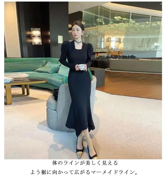 マーメイドワンピース オーガンスリーブ マーメイド ニット ワンピース タイトワンピース ロングワンピース スクエアネック ボリューム袖 パフスリーブ 上品 大人 かわいい おしゃれ フォーマル 二次会