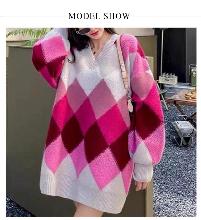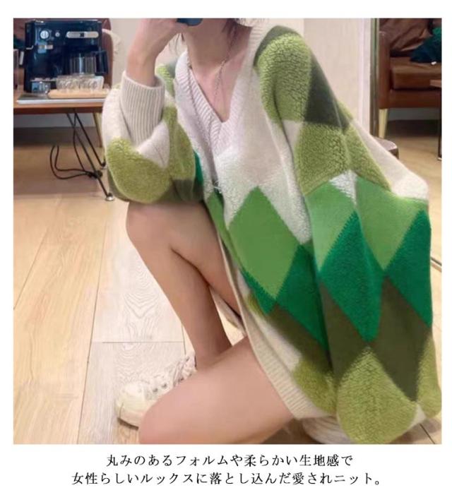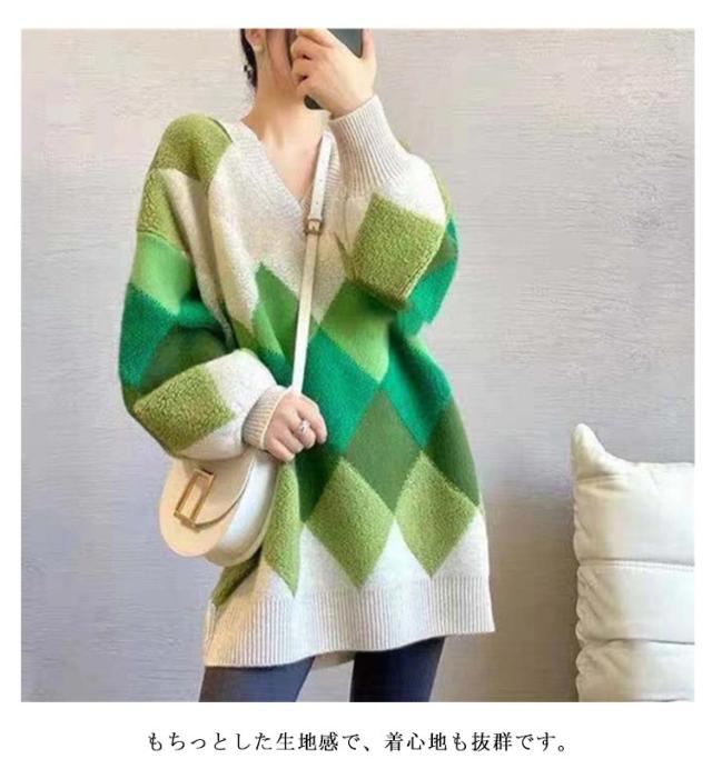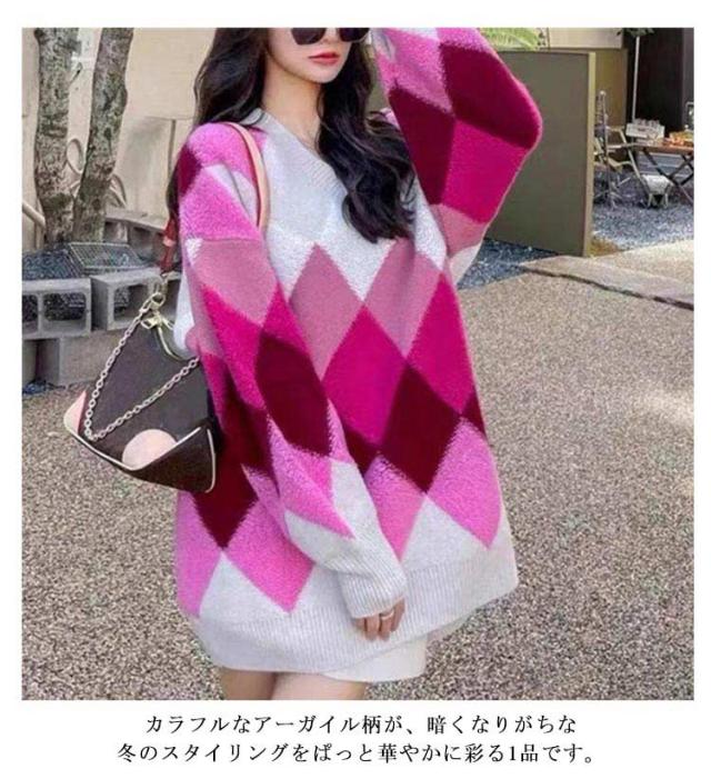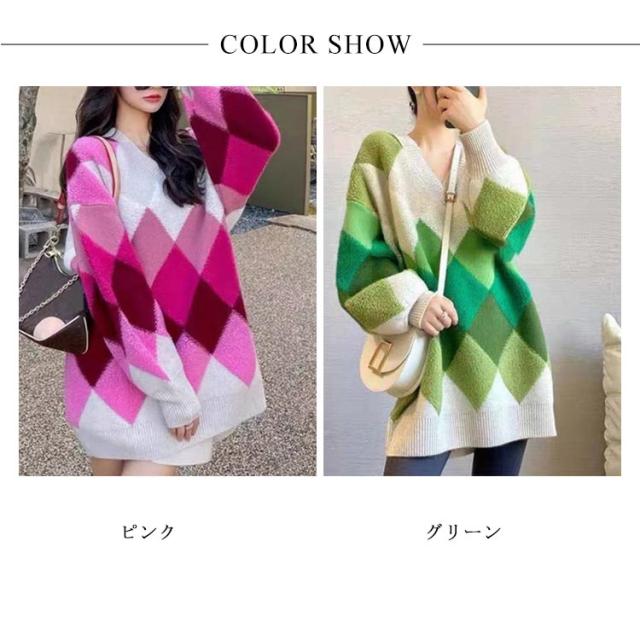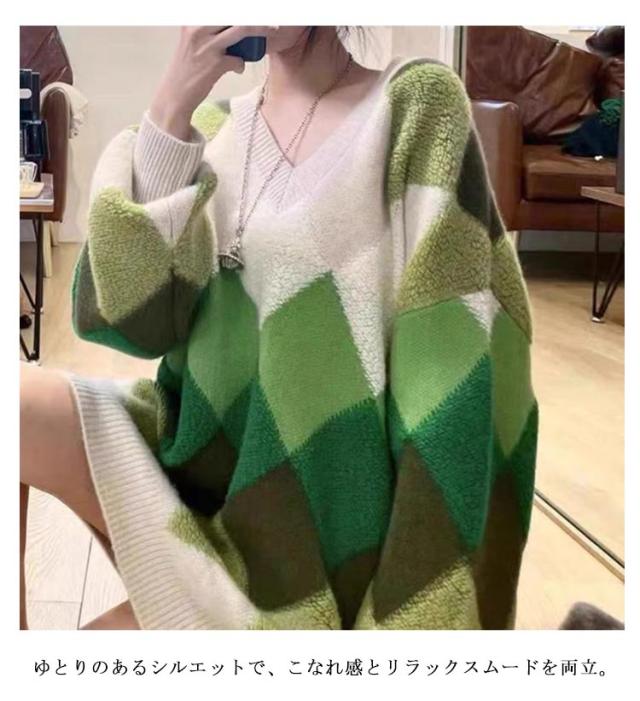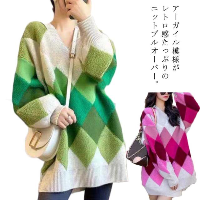 【送料無料】ニット プルオーバー Vネック アーガイル柄 配色 ボリュームスリーブ レディース ニット トップス ゆったり オーバーサイズ ボア切り替え 大人可愛い グリーン ピンク カラフル マルチカラー カジュアル おしゃれ