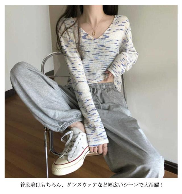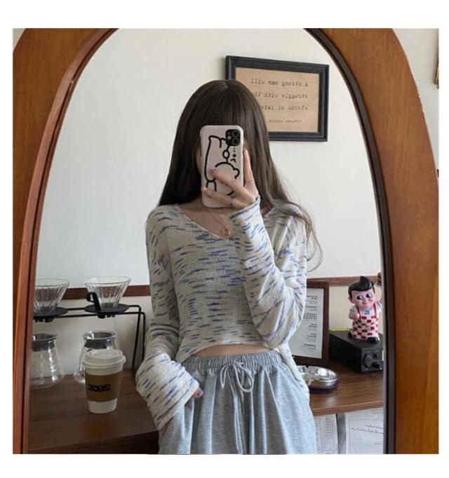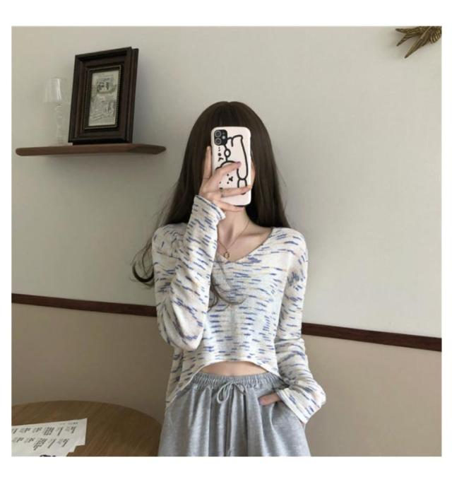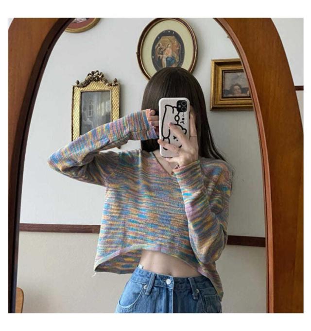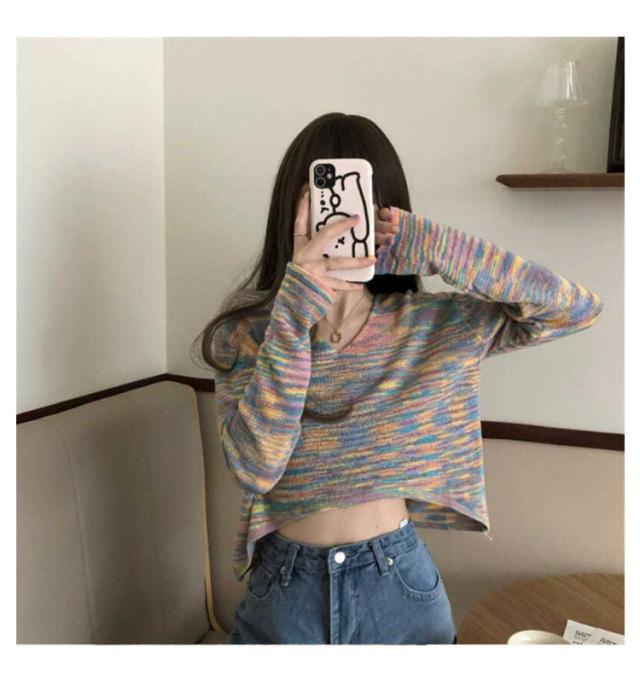 ショート丈 リブ地 ニットソー tシャツ レディース トップス ニット 薄手 長袖 リブニット スリムニット Vネック へそ出し ダンス衣装 セクシー かっこいい シンプル 無地 杢 虹色 カジュアル ヒップホップ ストリート系 10代 20代 30代 送料無料