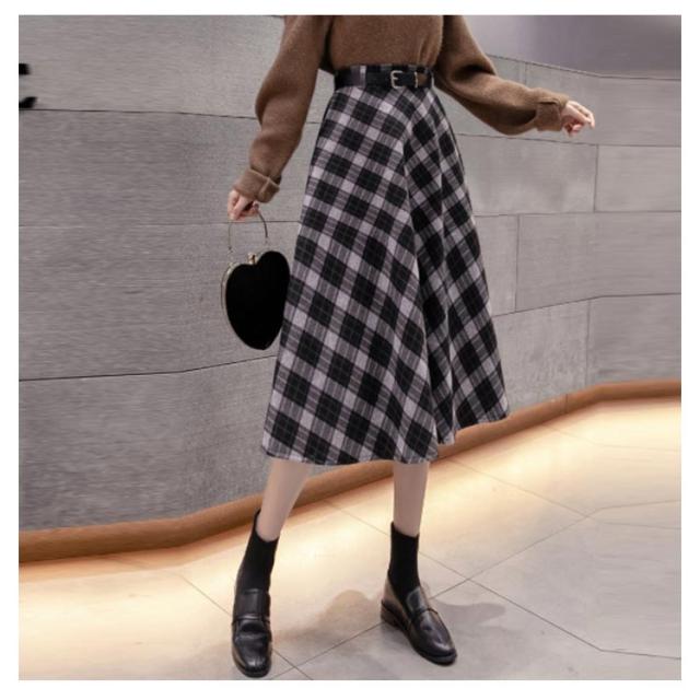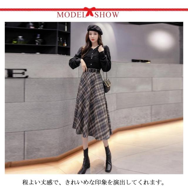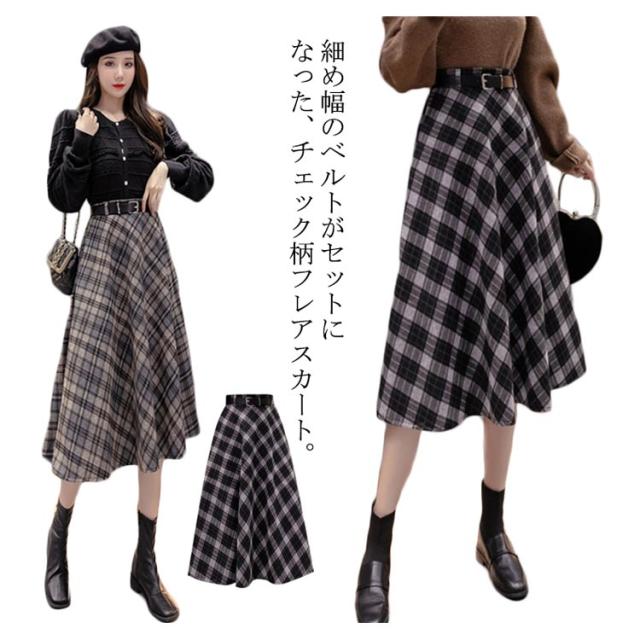 チェック柄 フレアスカート ベルト付き ロングスカート チェック柄 aラインスカート ウエストゴム ミモレ丈 膝下丈 総柄 レディース ボトムス スカート 大きいサイズ 体型カバー カジュアル