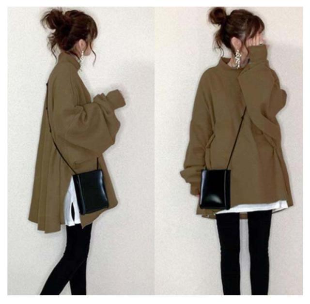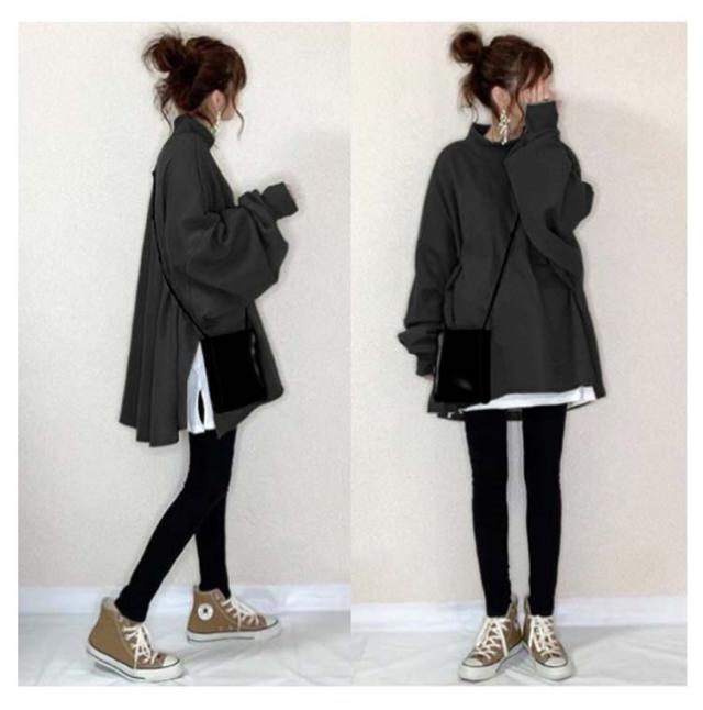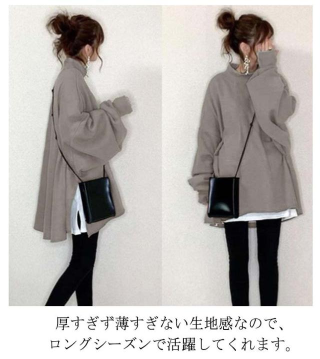 全10色 パーカー レディース トップス トレーナー スウェット プルオーバー ハイネック 重ね着風 サイドスリット 長袖 裾フレア ボリューム袖 ドロップショルダー ゆったり チュニック トップス カットソー シンプル 無地 ビッグシルエット