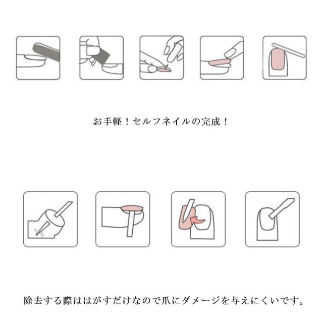 | 貼るだけで簡単ネイル! 一つ箱に24枚あります。 貼るだけで可愛いアートが楽しめるネイル! お手軽!セルフネイルの完成! 除去する際ははがすだけなので爪にダメージを与えにくいです。 | |