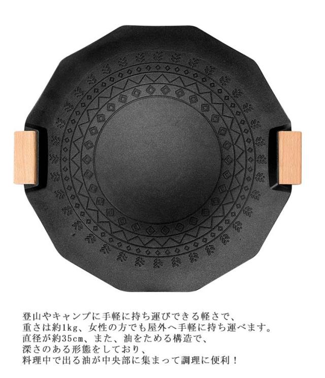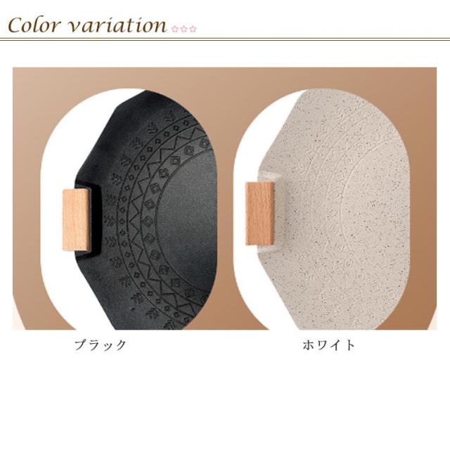 | サイズ:直径約35×高さ5cm 厚み4.5mm 重量:約959g 材質:アルミ素材、フッ素コーティング 取っ手:ブナ材 カラー:White / Black 対応熱源:ガス、IH、直火 登山やキャンプに手軽に持ち運びできる軽さで、重さは約1kg、女性の方でも屋外へ手軽に持ち運べます。 アルミ材質で、伝熱性能が優れ(銅:398、アルミ:237、鉄:80。単位:[W/m・K])。更に多様な熱源、ガスコンロ、IH、炭火での使用が可能。 直径が約35cm、また、油をためる構造で、深さのある形態をしており、料理中で出る油が中央部に集まって調理に便利! 耐久保障で、厚みを4.5mmに増厚しました。 | |