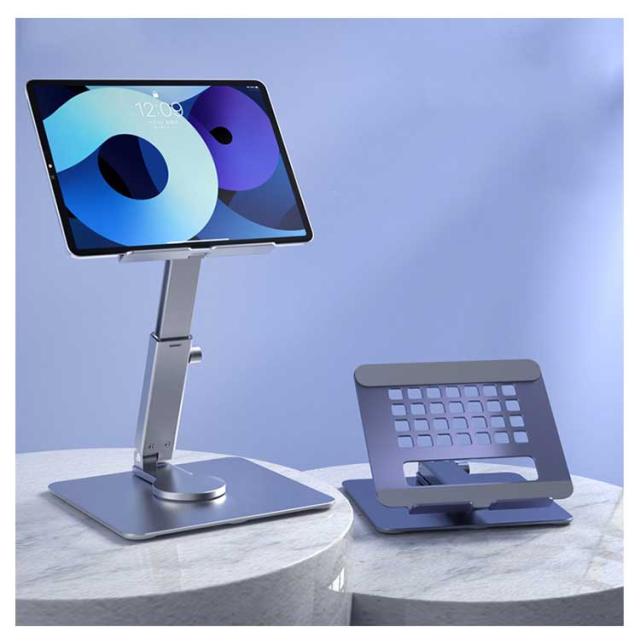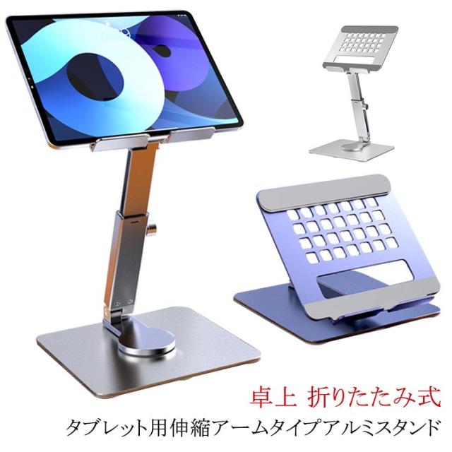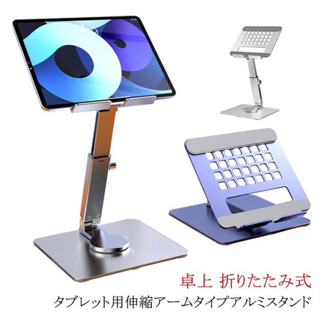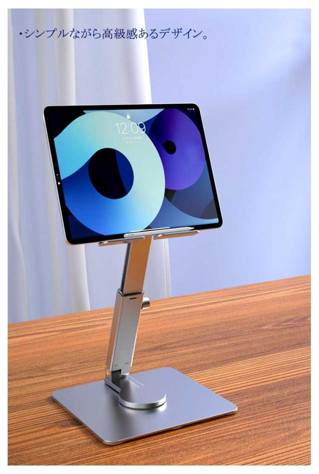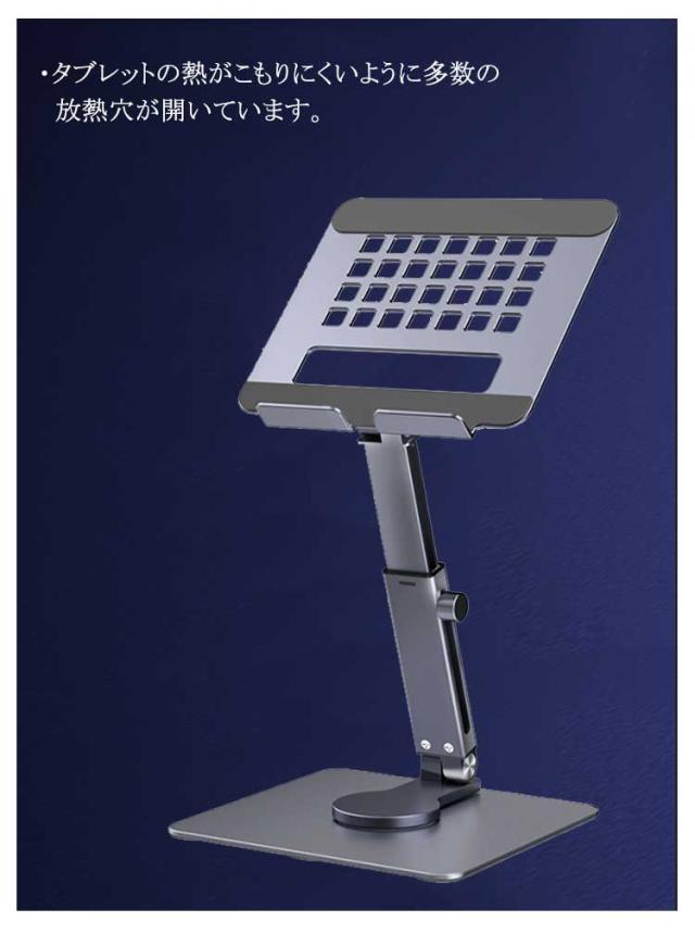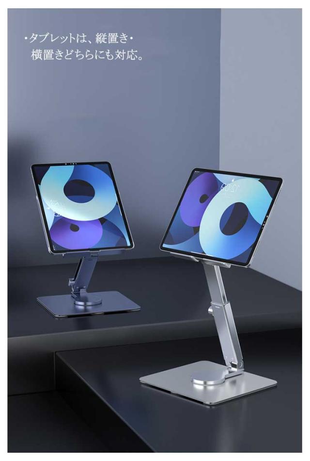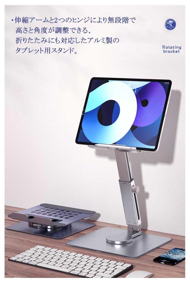 タブレットスタンド iPadスタンド 折りたたみ iPadProスタンド 360度回転 タブレット専用スタンド 360回転 高さ調整 角度調整可能 ポータブル 持ち運び便利 簡単収納 伸縮 安定 放熱 シリコン製固定パッド テレワーク オフィス ビジネス アルミ合金 全2色
