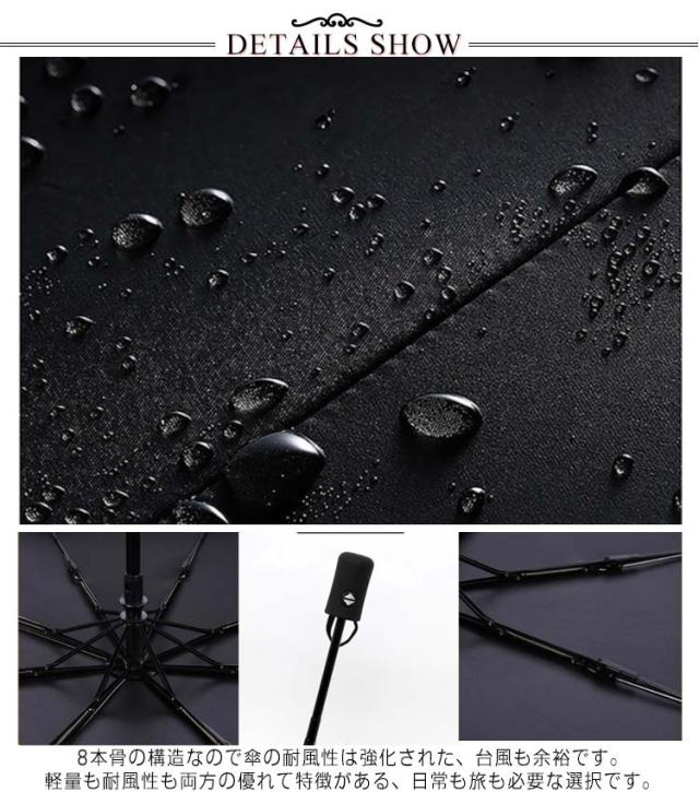 | 手元の開閉スイッチを押すだけで傘が自動的に開きます。 傘が閉じたら、傘の両端を両手で挟むようにして、シャフトを水平に縮めます。カチッと音がするまで、押し込んでください。 8本骨の構造なので傘の耐風性は強化された、台風も余裕です。軽量も耐風性も両方の優れて特徴がある、日常も旅も必要な選択です。 車の乗り降りも便利です。逆戻り回避、ワンタッチ自動開閉と合わせ、片手でも楽々。 | |