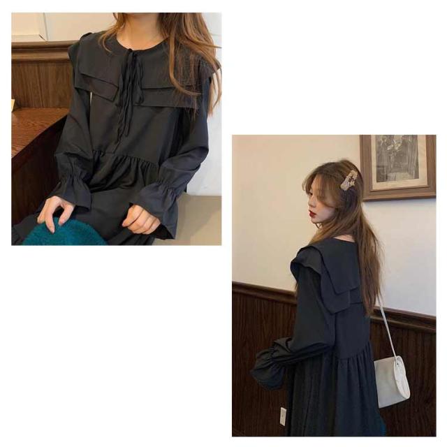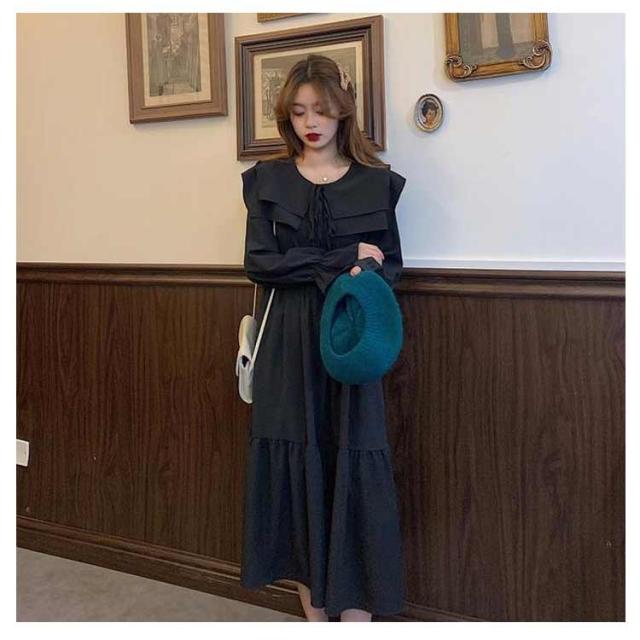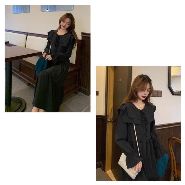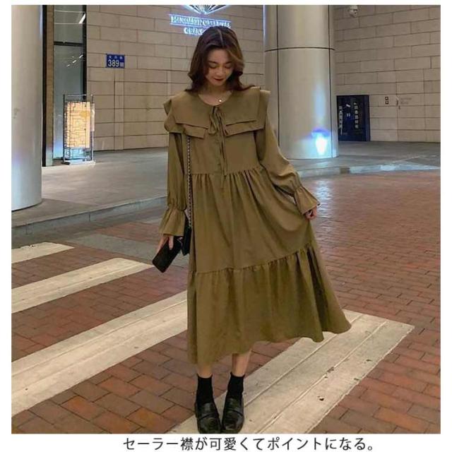 ワンピース トレンド ロング セーラーワンピース 海軍風 セーラー襟 長袖 フリル レディース 妊婦 マタニティ ブラック 可愛い ゆったり 大きいサイズ 爽やか 送料無料