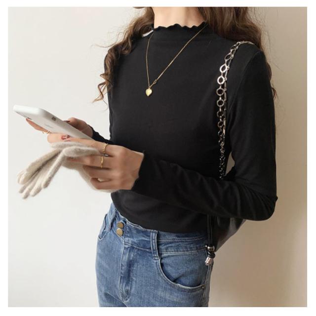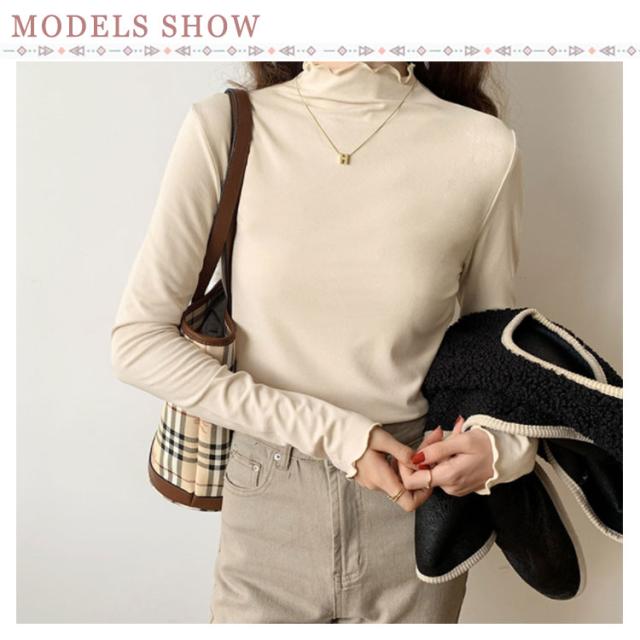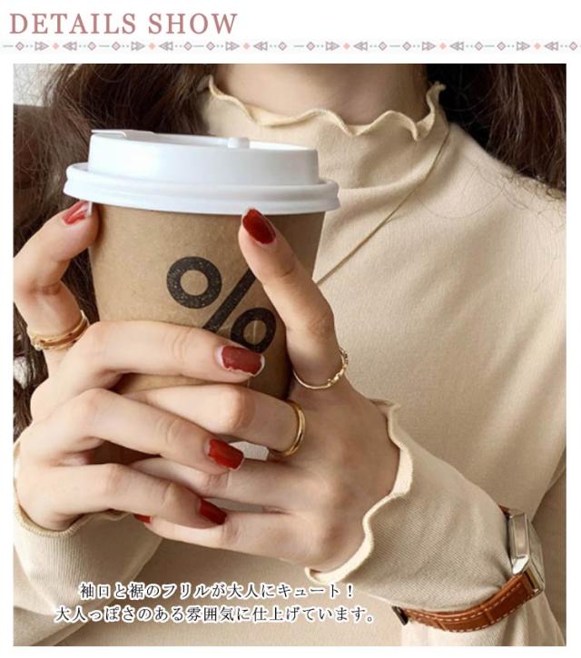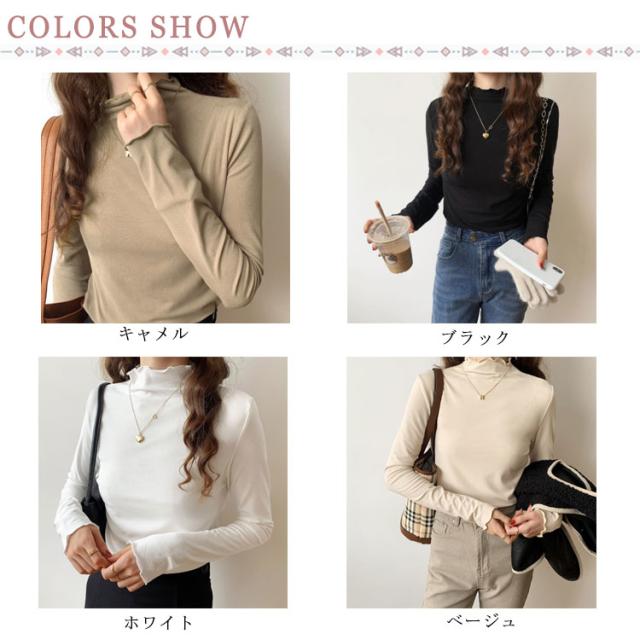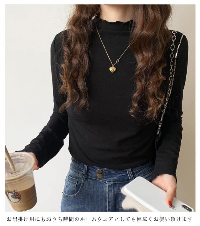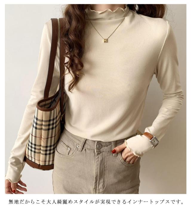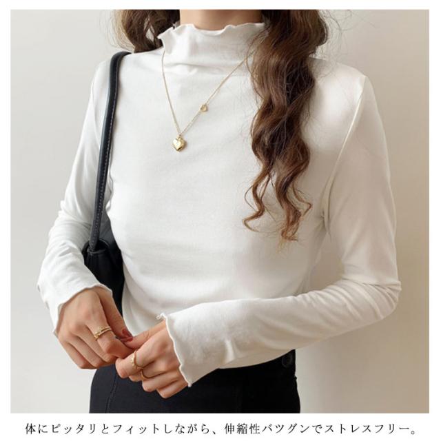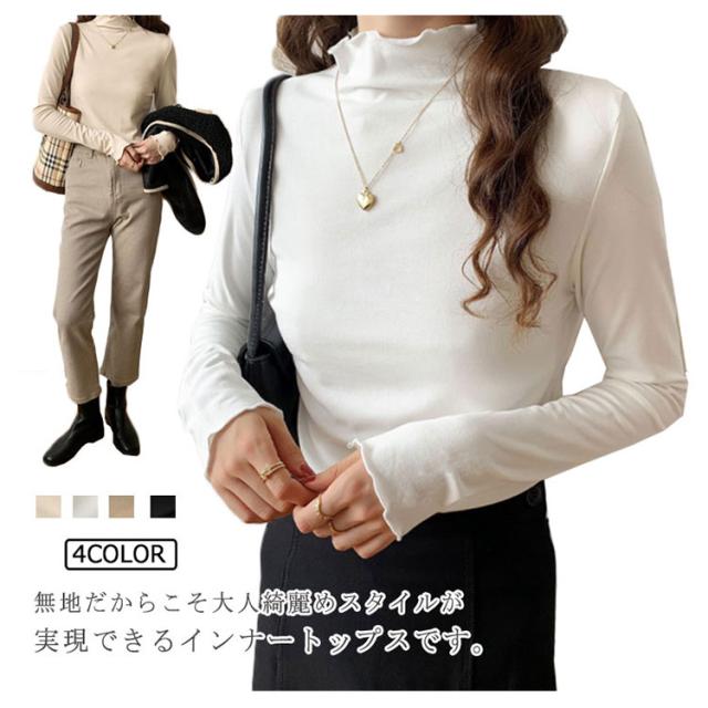 トップス Tシャツ カットソー 長袖 ハイネック タートルネック レディース フリル インナー 薄手 重ね着 春秋 お洒落 レイヤード風 キレイめ