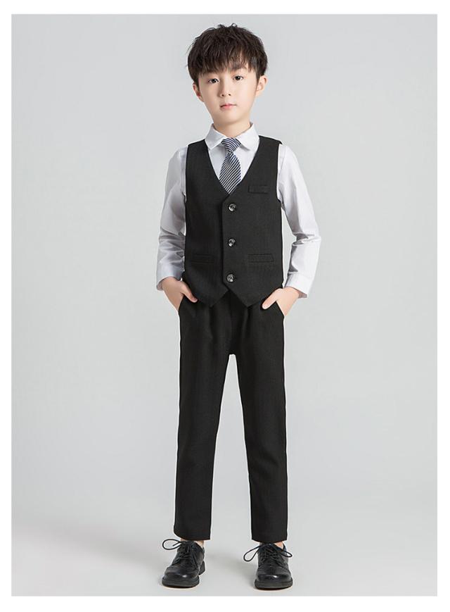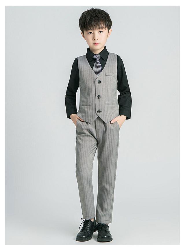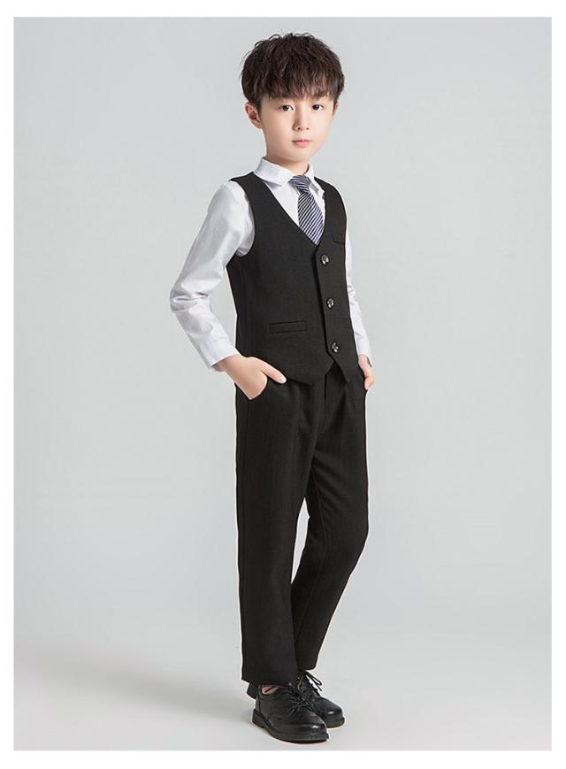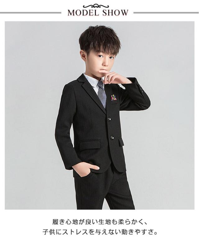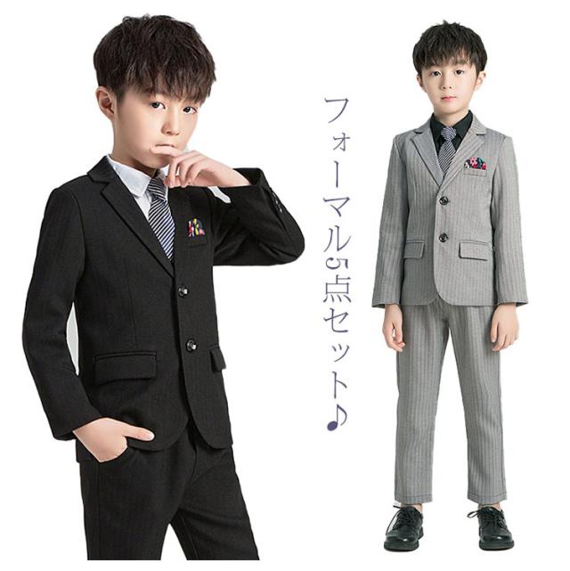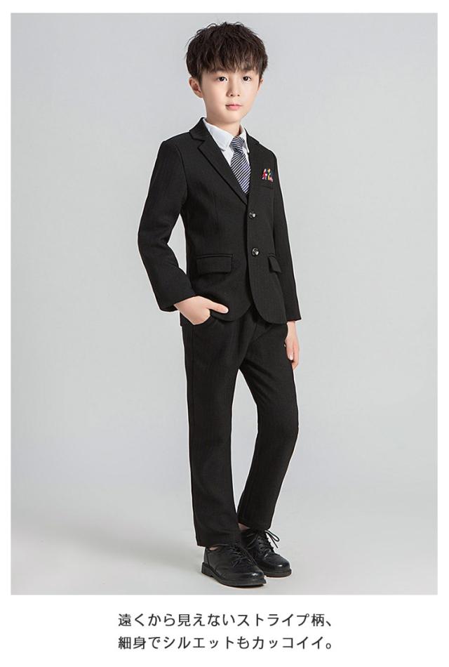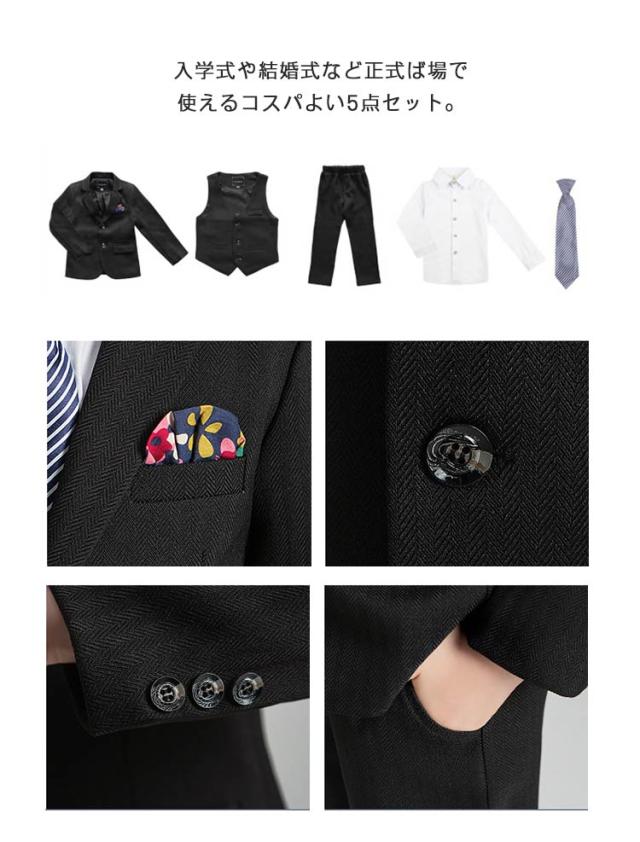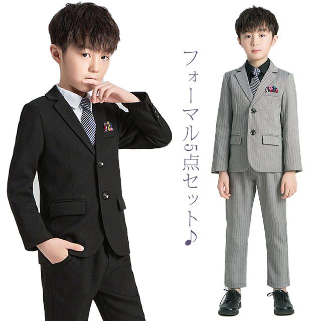 フォーマルスーツ 男の子 スーツ キッズ 子供服 5点セット セットアップ タキシード ジャケット シャツ ベスト ズボン ネクタイ ストライプ 黒 ジュニア 卒園 入園 小学生 入学式 卒業式 七五三 結婚式 発表会