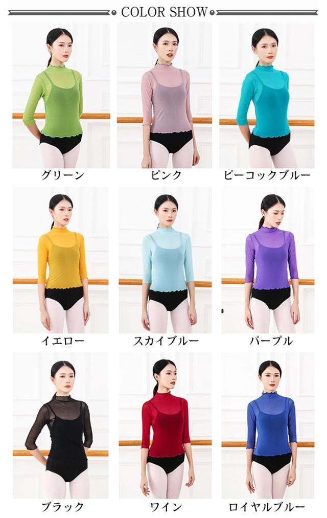 | ・七分丈のストレッチメッシュトップスです。 ・伸縮性のあるメッシュ素材での体にピタッと密着するのでレッスン中のボディラインの確認がバッチリできます。 ・鮮やかな色でシンプルなレオタードに重ね着すると素敵です! | |