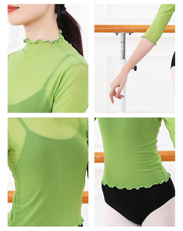 バレエ トップス ハイネック 袖フリル 7分袖 メッシュ シースルートップス ダンスウェア ヨガウェア バレエ上着 透け感 ストレッチ 通気性 ウォームアップトップス 冷え防止 夏 無地 全10色