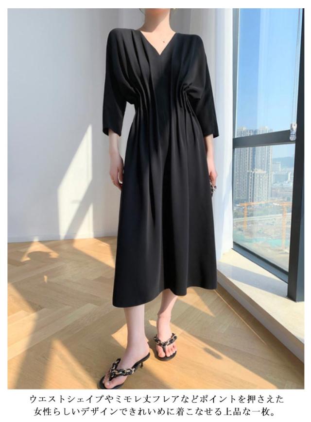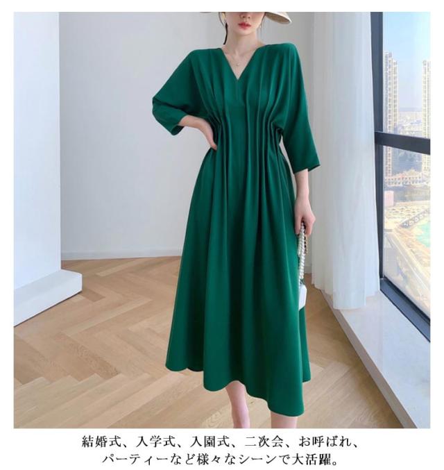 ワンピース ドレス 7分袖丈 タックワンピース 春新作 レディース Vネック ロングワンピース 送料無料 ウエストシェイプ ハイウエスト ピンタック 落ち感 Aライン ドルマンスリーブ 結婚式