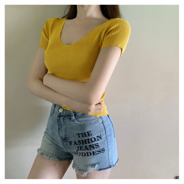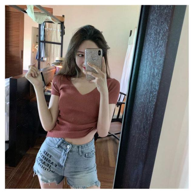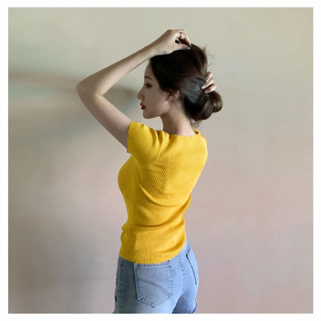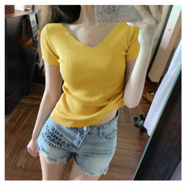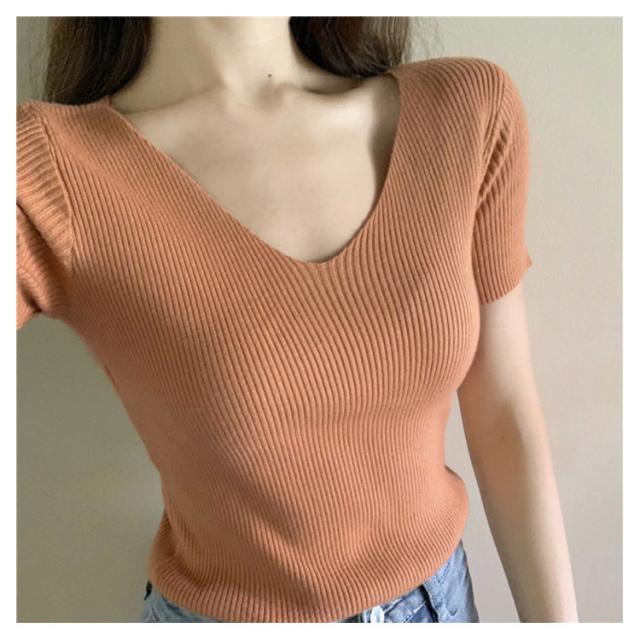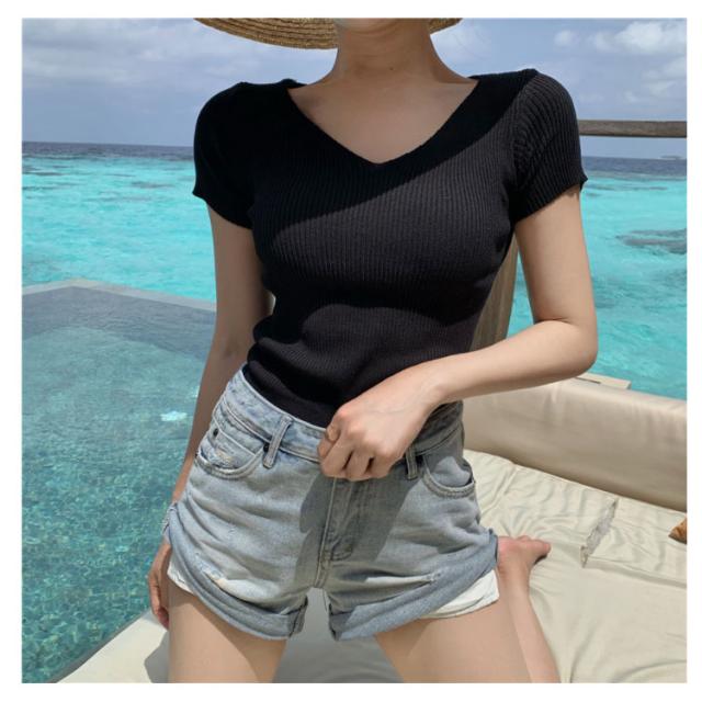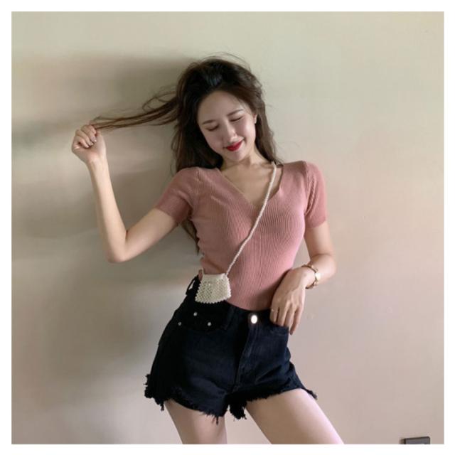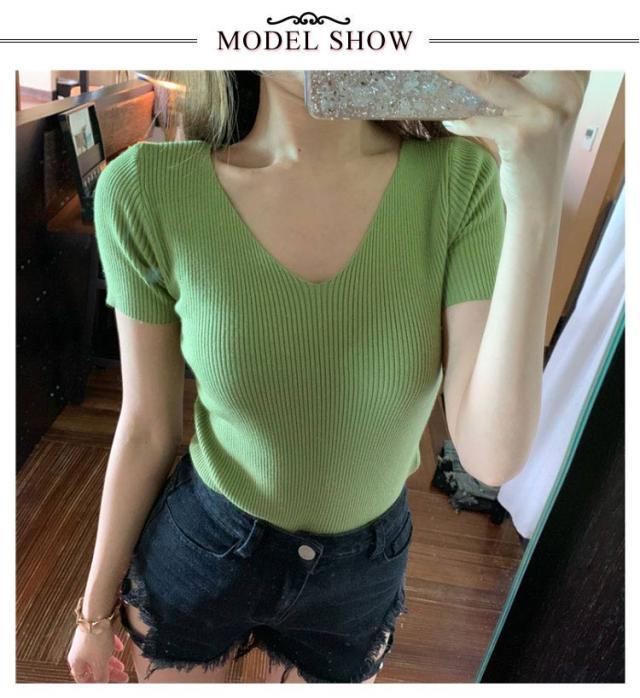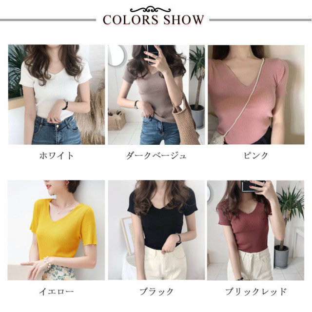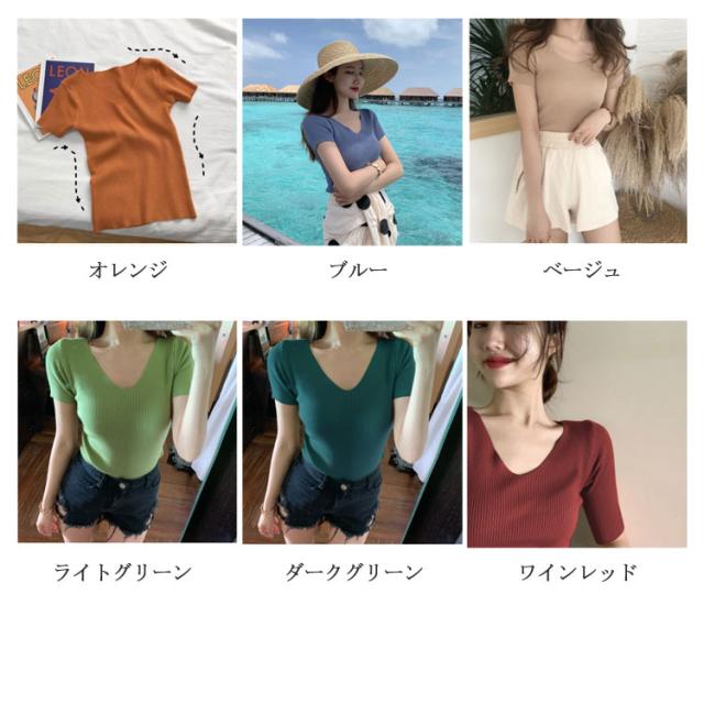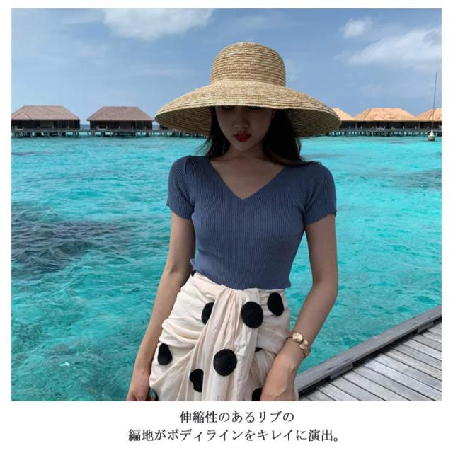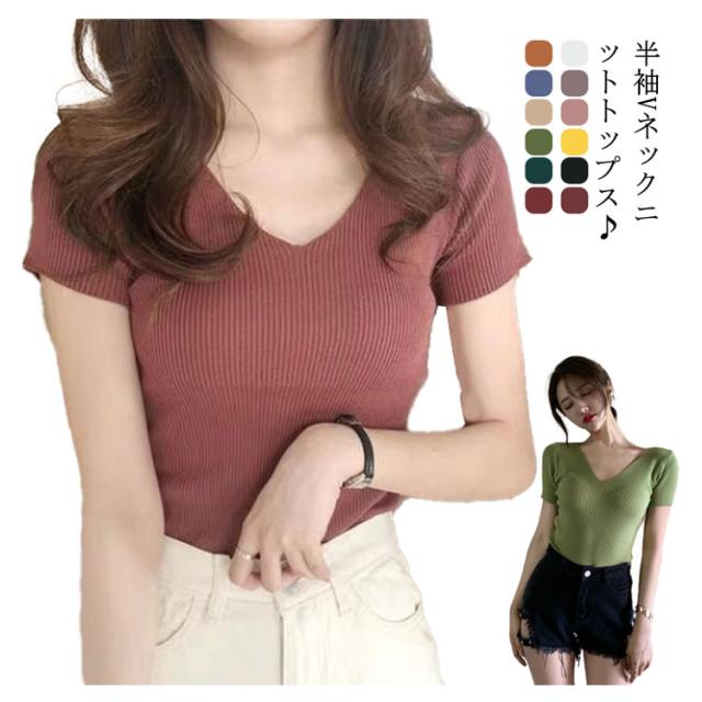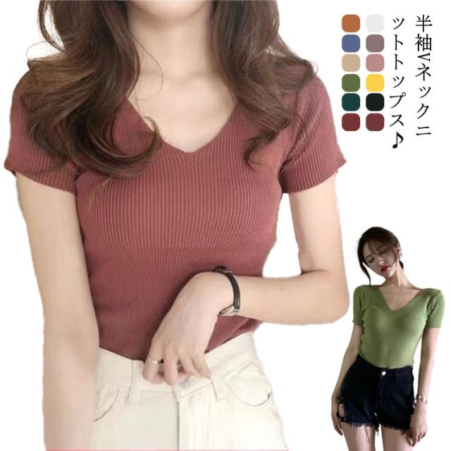 サマーニット 半袖 レディース Vネック ニットトップス リブニット 半袖 Tシャツ ニットTシャツ Tシャツ ニットソー カットソー ストレッチ ショート丈 セクシー 薄手 無地 オフィス 送料無料