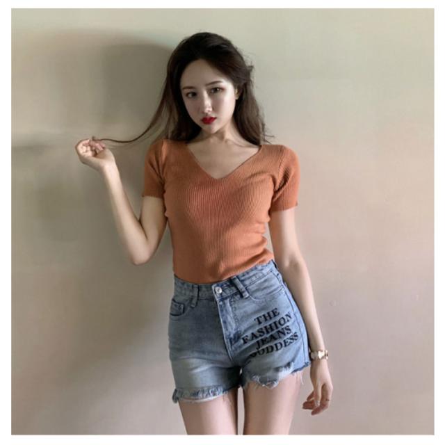 | 半袖Vネックニットトップス♪ 肌に優しく柔らかで、サラッとした生地感が心地良い一着。 伸縮性のあるリブの編地がボディラインをキレイに演出。 色展開豊富なのでコーディネートに合わせて何枚あっても困りません! | |
