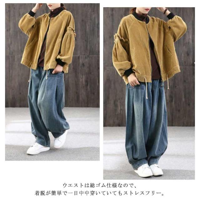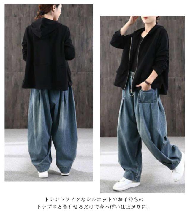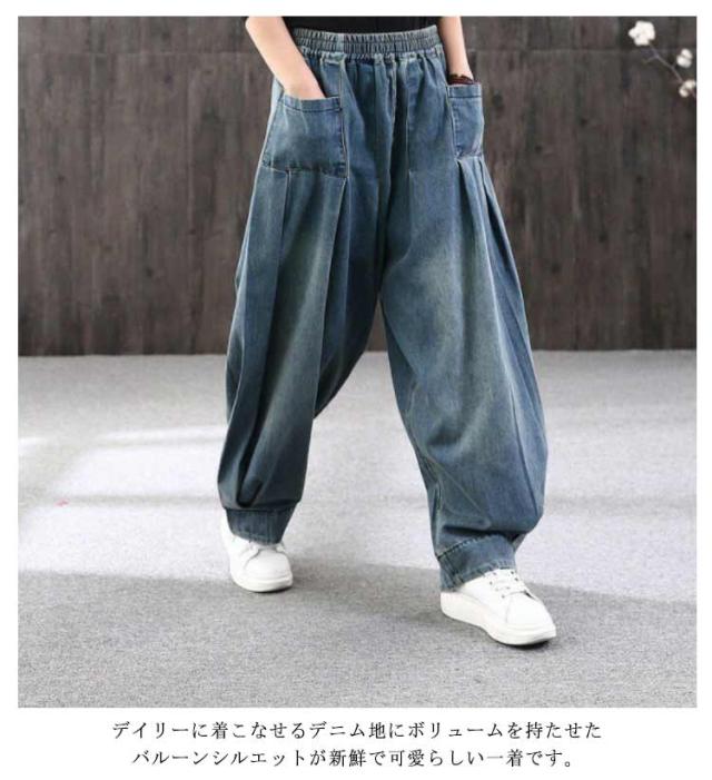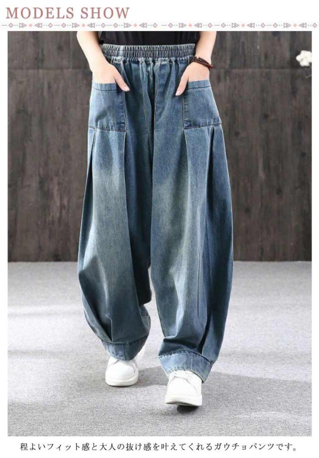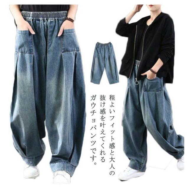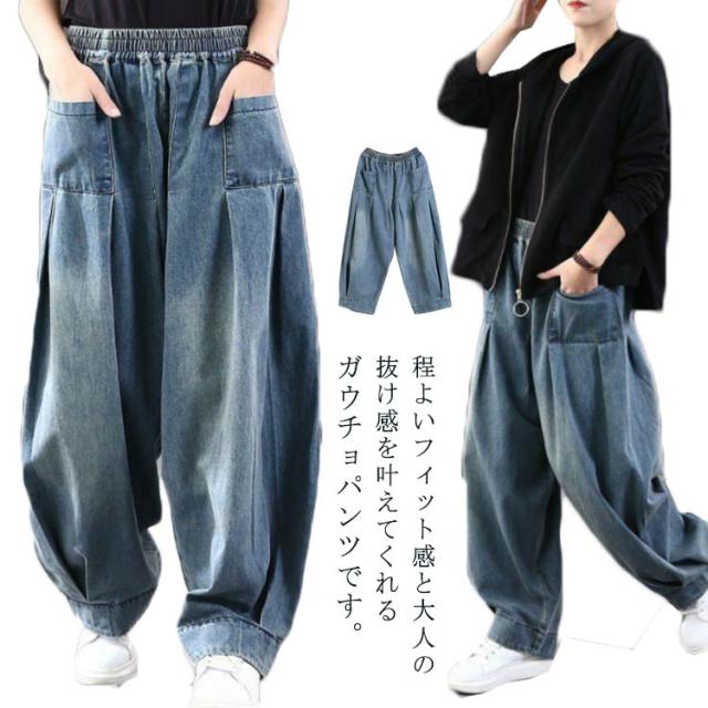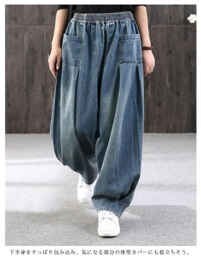 サルエルパンツ レディース デニムパンツ ワイドパンツ ボトムス 普段着 ガウチョパンツ ロング丈 カジュアル 体型カバー お出掛け 春秋 ジーパン ウエストゴム