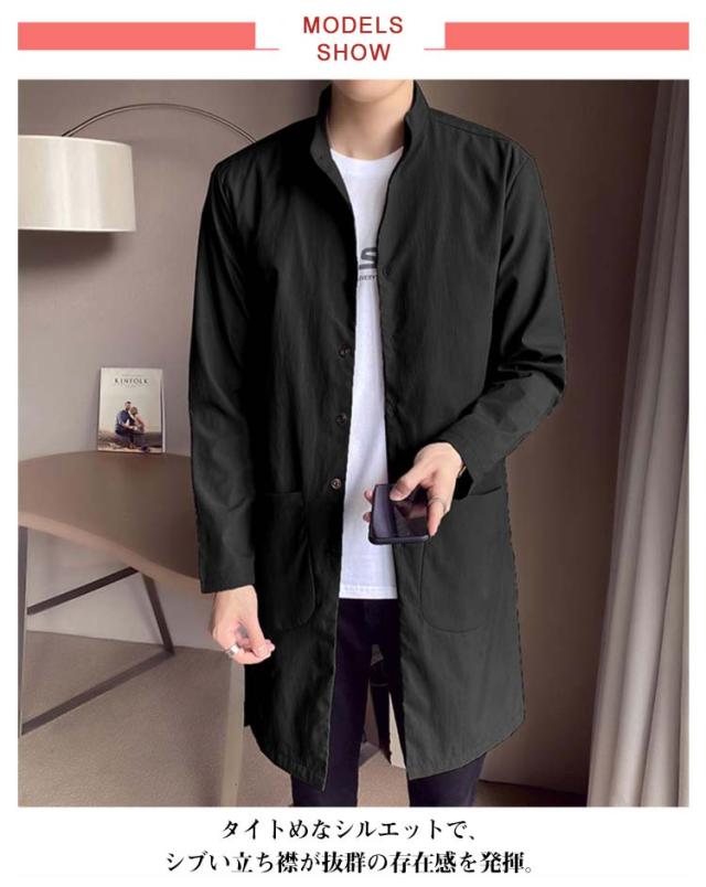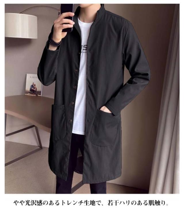 | 上品さとカジュアルな雰囲気をバランスよく漂わせてくれるメンズコート。 タイトめなシルエットで、シブい立ち襟が抜群の存在感を発揮。 やや光沢感のあるトレンチ生地で、若干ハリのある肌触り。 羽織るだけで旬なスタイリングが完成、カジュアルにも綺麗目にも使えます。 独特の素材と統一感のあるデザインでこれからの季節に活躍する事間違いなしです。 M〜5XLサイズという豊富なサイズ展開となっております。いずれもクラシカルな色展開で、大人な印象を与えてくれます。 | |