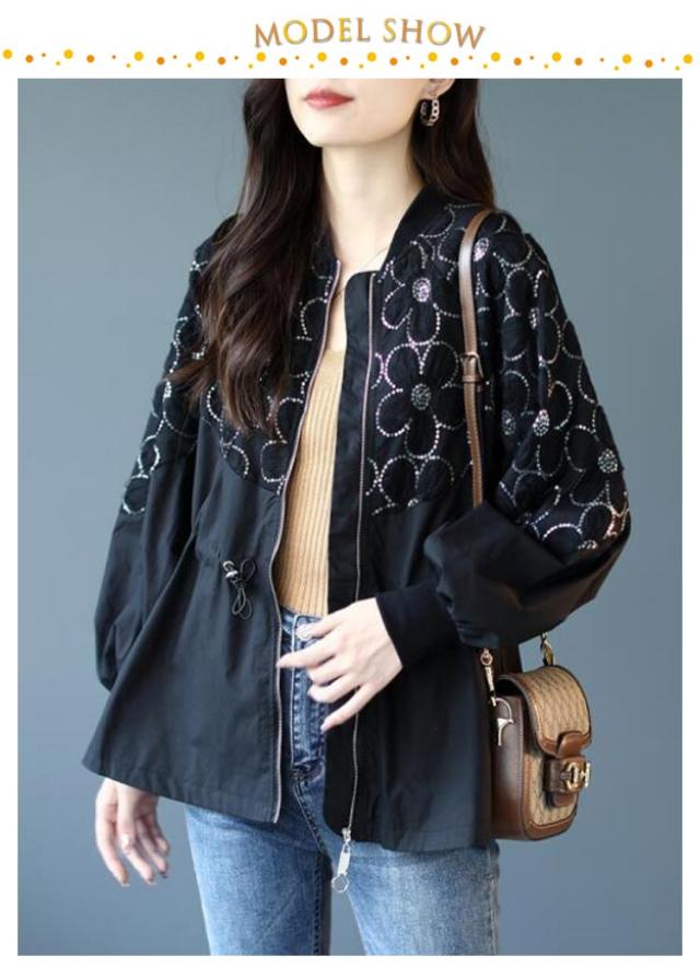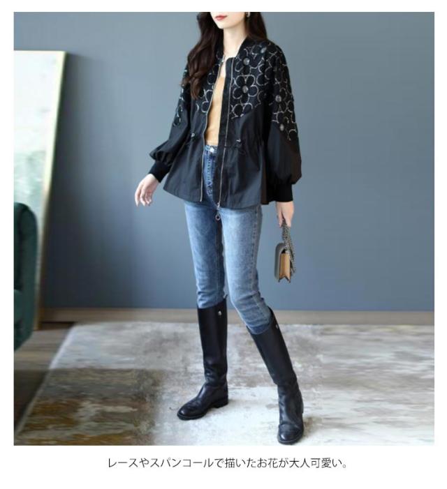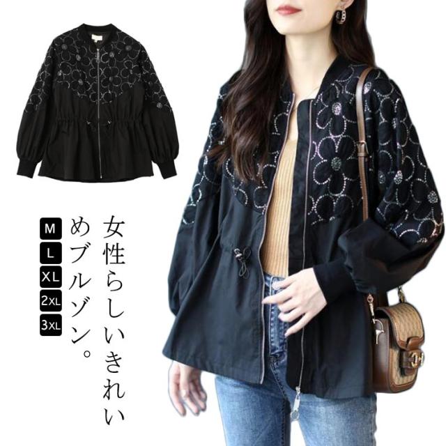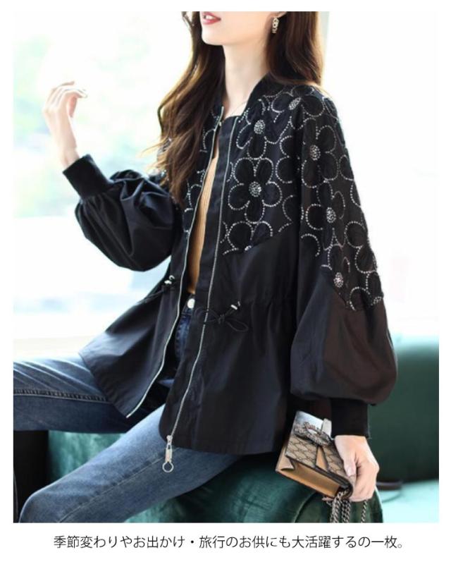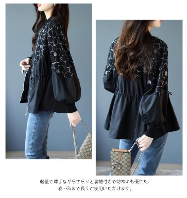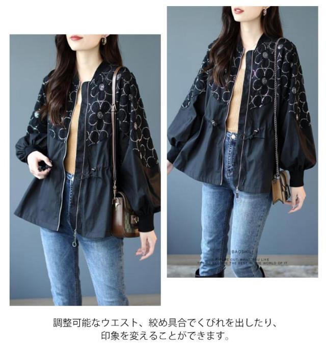 スプリングコート レディース ブルゾン フレア トレンチコート 大きいサイズ 羽織り アウター ジャケット 送料無料 スパンコール 花 レース 大人可愛い ゆったり パフスリーブ 着やせ ママ カジュアル