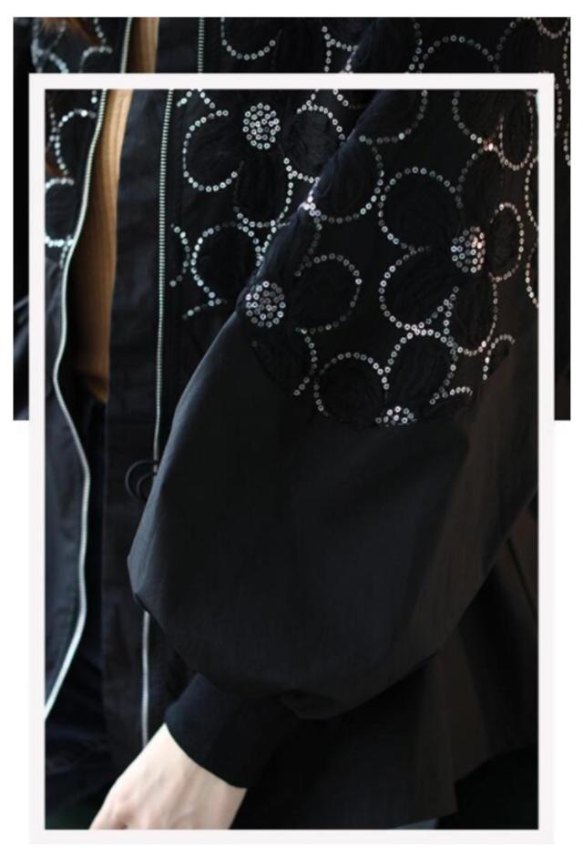 | 女性らしいきれいめブルゾン。 軽量で薄手ながらさらりと裏地付きで防寒にも優れた、春〜秋まで長くご使用いただけます。 調整可能なウエスト、絞め具合でくびれを出したり、印象を変えることができます。 レースやスパンコールで描いたお花が大人可愛い。 季節変わりやお出かけ・旅行のお供にも大活躍するの一枚。 | |