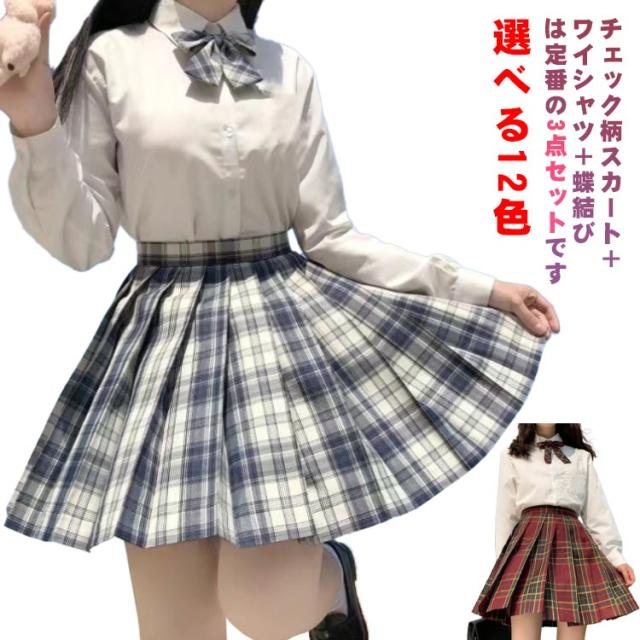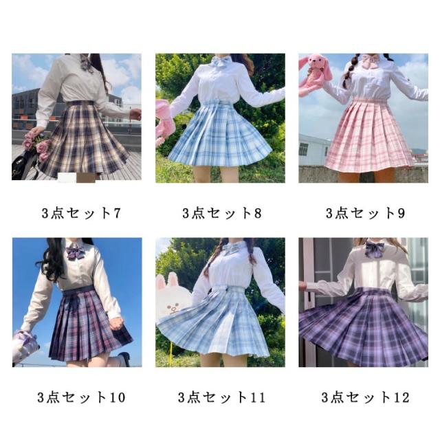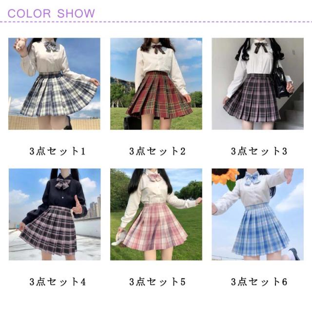3点セット 選べる12色 学生服 女子高生 女子制服 3点 スクールシャツ+スカート+リボン 上下セット 長袖 チェック柄 コスプレ 仮装 コスチューム プリーツスカート 高校生 中学生 学生 学校 通学 女子 入学 スクール 制服セット 可愛い 学園祭 大人