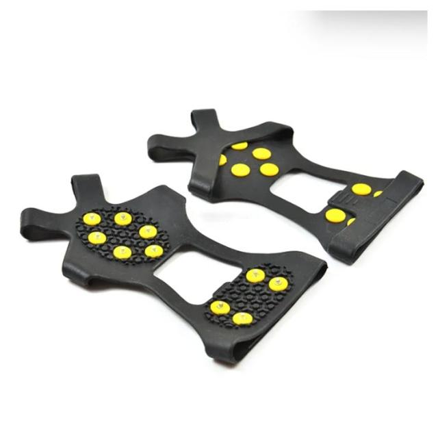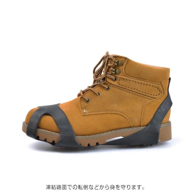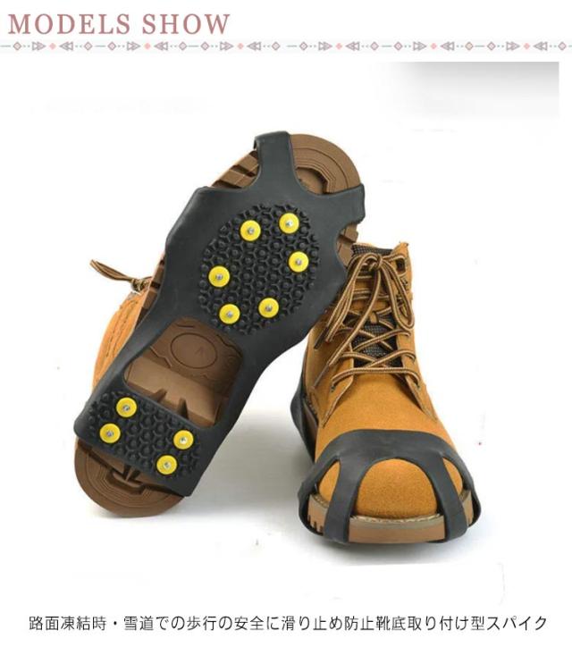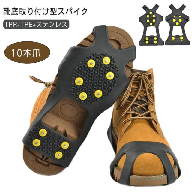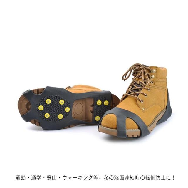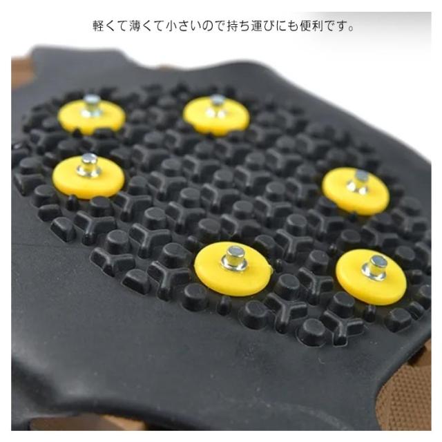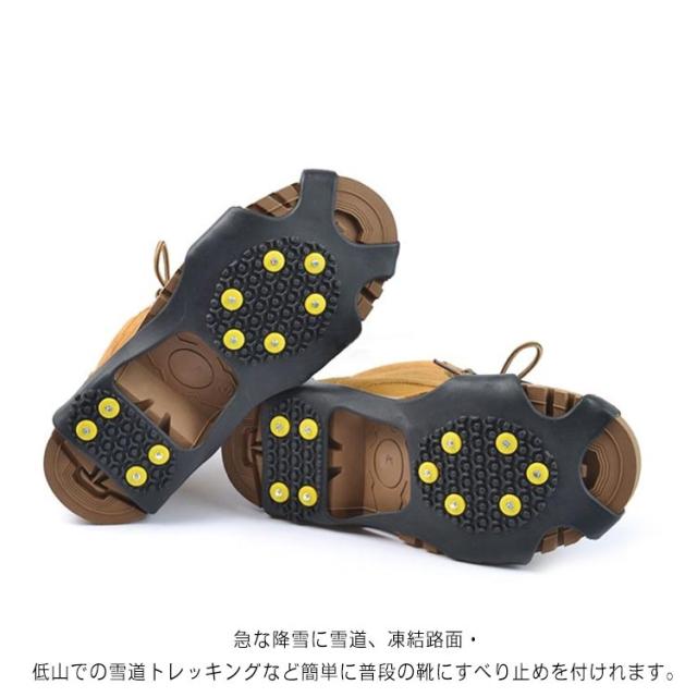 | 靴底取り付け型スパイク 10本爪 路面凍結時・雪道での歩行の安全に滑り止め防止靴底取り付け型スパイク 通勤・通学・登山・ウォーキング等、冬の路面凍結時の転倒防止に! 凍結路面での転倒などから身を守ります。 急な降雪に雪道、凍結路面・低山での雪道トレッキングなど簡単に普段の靴にすべり止めを付けれます。 軽くて薄くて小さいので持ち運びにも便利です。 装着はつま先とかかとにひっかけるだけで完了です。 | |