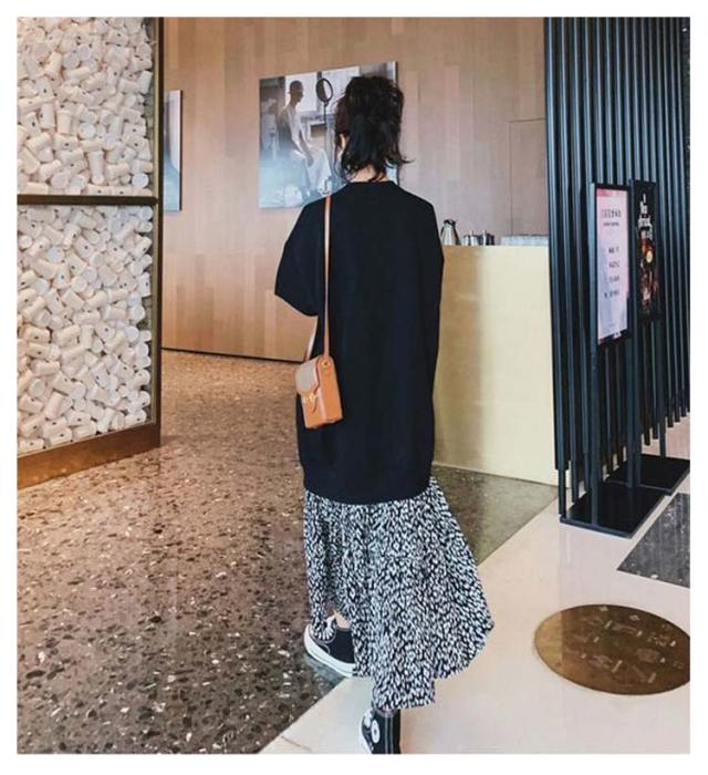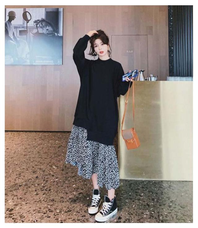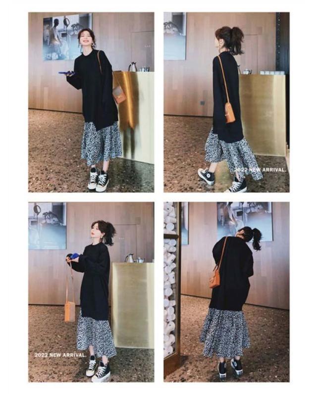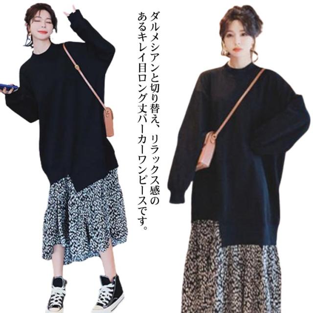 パーカーワンピース 大きいサイズ ダルメシアン柄 切り替え ワンピース 長袖 フェイクレイヤード ロングワンピース ロングパーカー ゆったり 体型カバー 春 秋 カジュアル かわいい 韓国ファション M L XL 2XL 3XL 4XL
