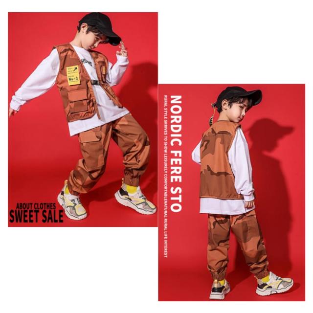 ヒップホップ ダンス衣装 セットアップ キッズ ダンス衣装 ベスト 長ズボン 上下セット 2点セット 迷彩柄 男の子 女の子 ユニセックス 子ども ダンス衣装 K-POP 子供服 こども服 キッズ服 ノースリーブ トップス ウエストゴム レッスンウエア ストリート系 原宿系 送料無料