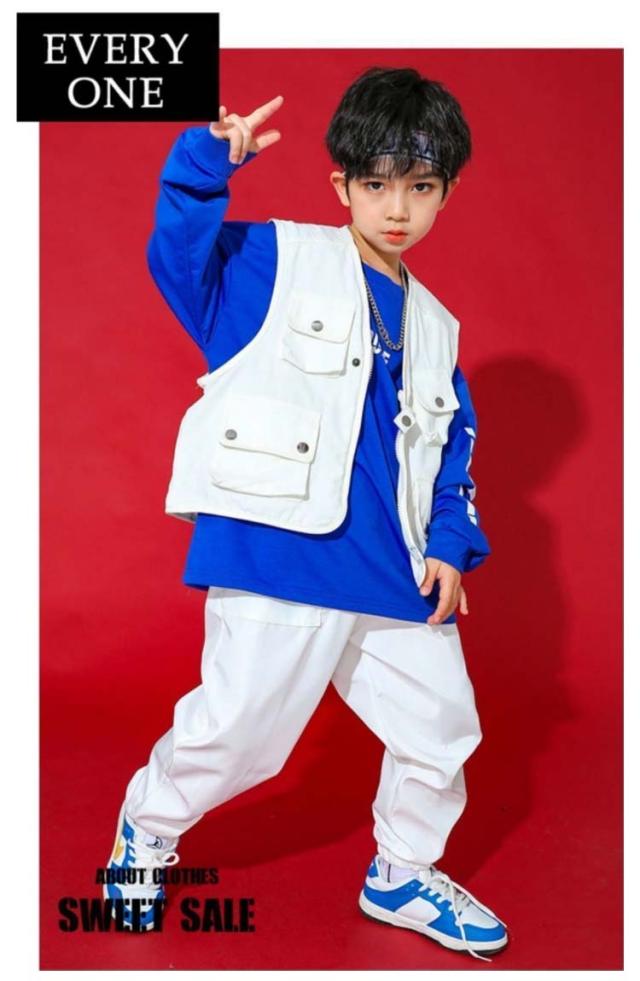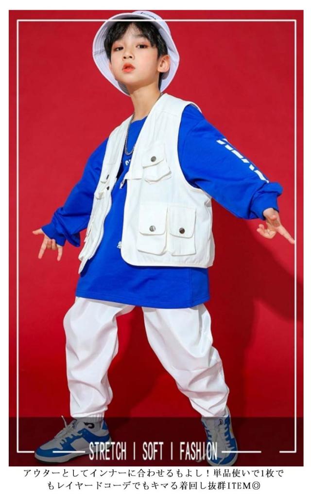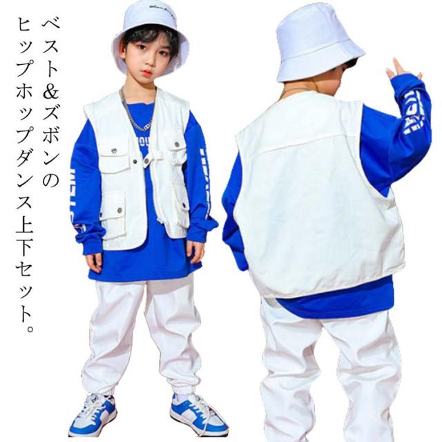 キッズ セットアップ ヒップホップ ダンス衣装 ベスト 長ズボン 上下セット 子ども 男の子 女の子 ノースリーブ トップス ロングパンツ 2点セット ウエストゴム ダンスウェア ユニセックス 子供服 こども服 キッズ服 レッスンウエワイト
