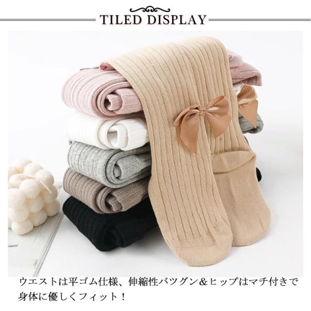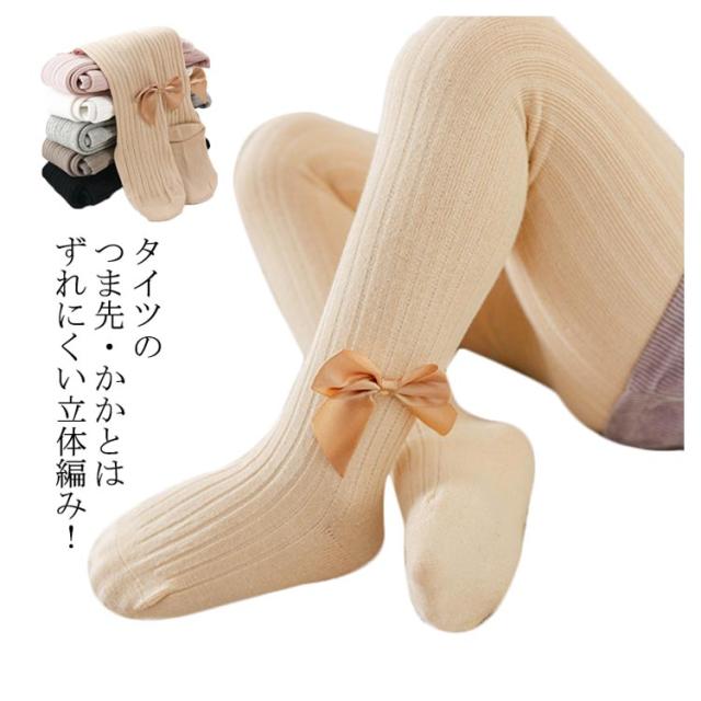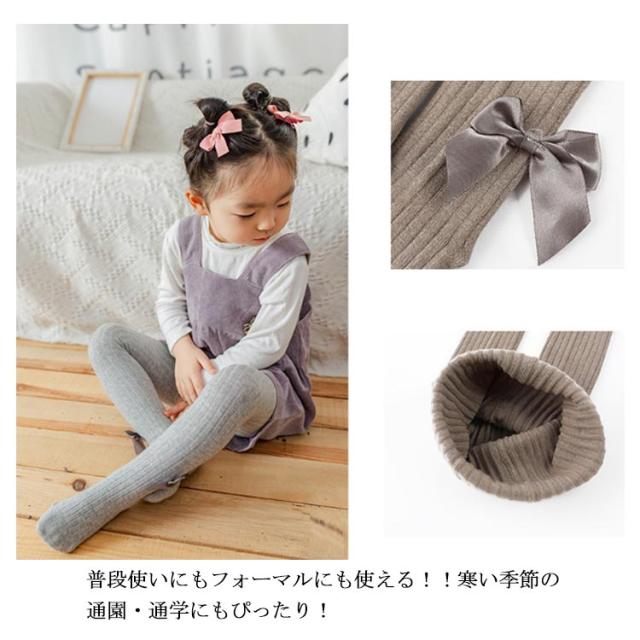 | タイツのつま先・かかとはずれにくい立体編み! リブ編みとなカラーで合わせやすく、毎日のコーデに大活躍! さりげなくある 足首サイドのワンポイントリボンが、とってもかわいい。 ウエストは平ゴム仕様、伸縮性バツグン&ヒップはマチ付きで身体に優しくフィット! 普段使いにもフォーマルにも使える!!寒い季節の通園・通学にもぴったり! | |
