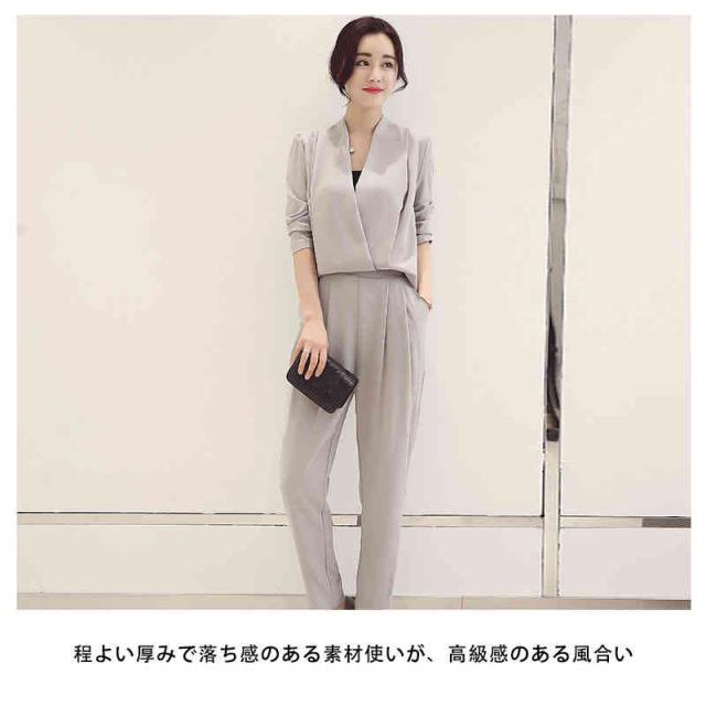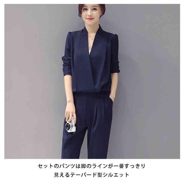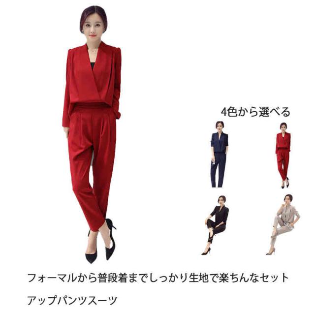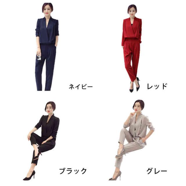 スーツ セットアップ パンツドレス オールインワン レディース 長袖 V首 Vネック テーパードパンツ スーツセットアップ パンツスーツ サイドポケット付き 通勤 フォーマル カジュアルスーツ セレモニー ママスーツ 入学式 発表会 参観日 入園式 お呼ばれ 普段着 無地