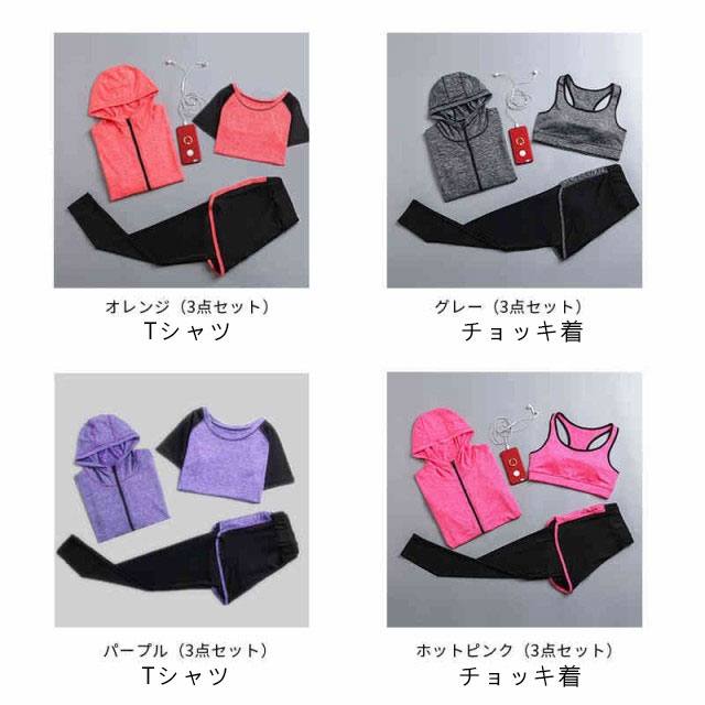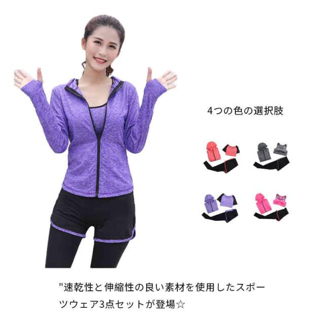 トレーニングウェアセット レディース 上下セット 3点ゼット スポーツウェア ランニングウェア ウォーキング トップス パーカー 半袖 パンツ レギンス ライン入り セットアップ フィットネスウェア ヨガウェア ジム