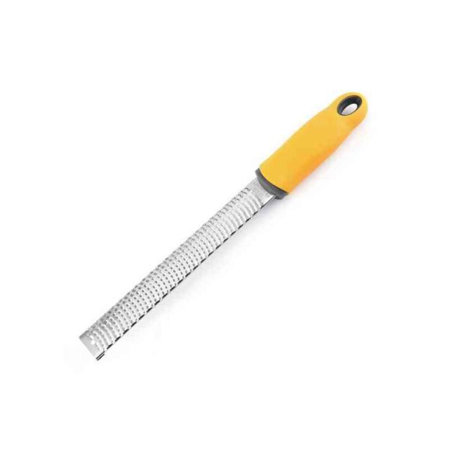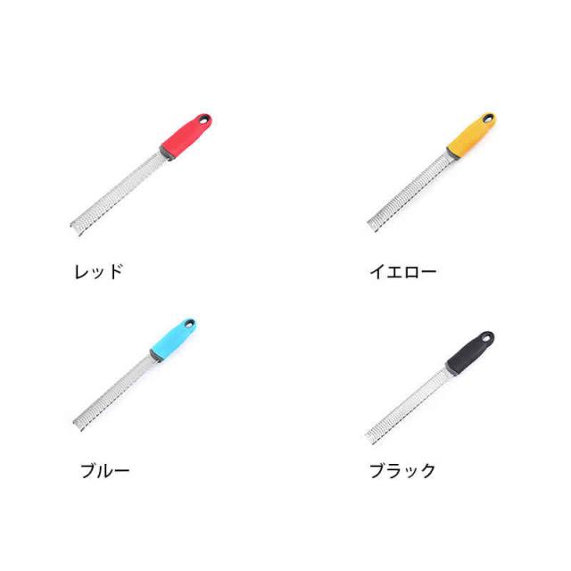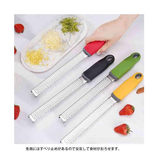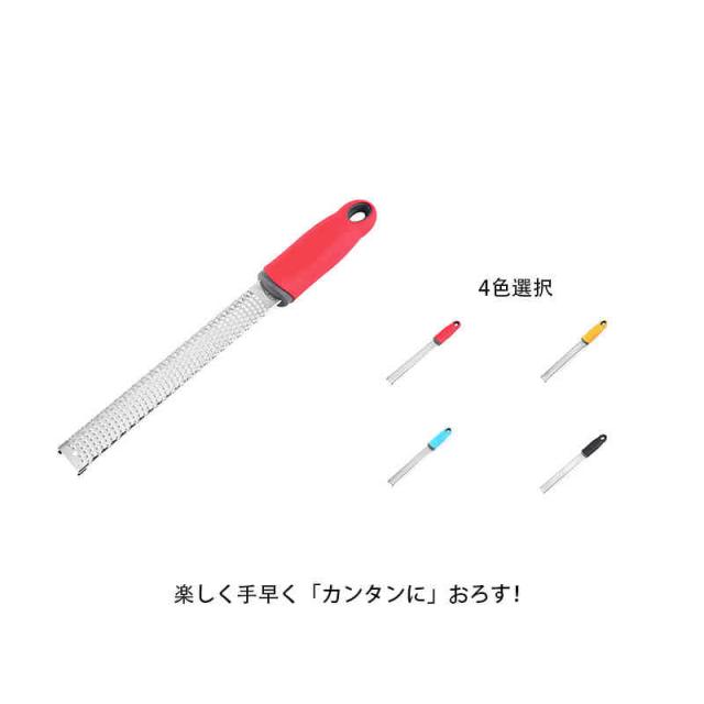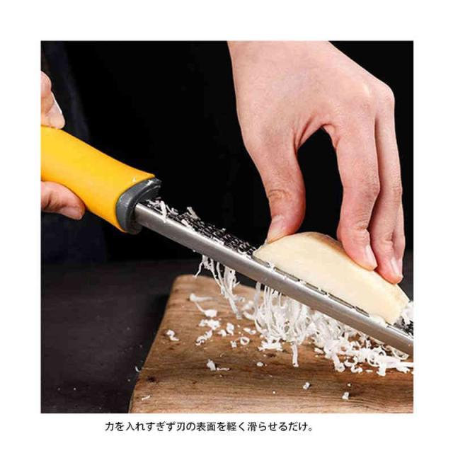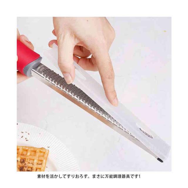 | 楽しく手早く「カンタンに」おろす! 力を入れすぎず刃の表面を軽く滑らせるだけ。 素材を活かしてすりおろす。まさに万能調理器具です! 先端にはすべり止めがあるので安定して食材がおろせます。 横幅わずか2.5cmのスリムな形状は、収納場所を取りません。 掃除ブラシと専用ケース付きで衛生的で安全に保管できます。 | |