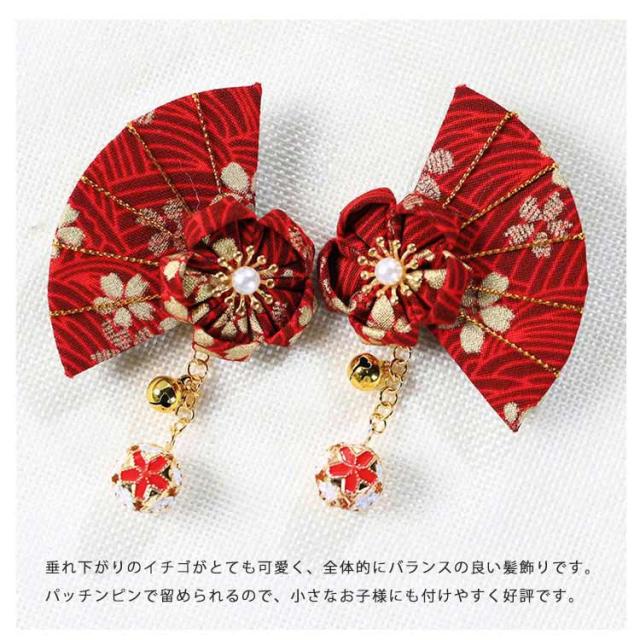 | 細部までこだわった作りになっており、職人さんの繊細さを感じます。 垂れ下がりのイチゴがとても可愛く、全体的にバランスの良い髪飾りです。 パッチンピンで留められるので、小さなお子様にも付けやすく好評です。 大きすぎず、3歳のお子様にぴったりの髪飾りです。 | |