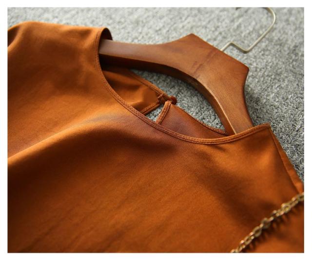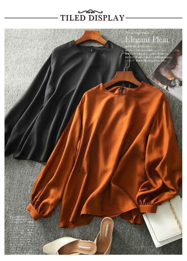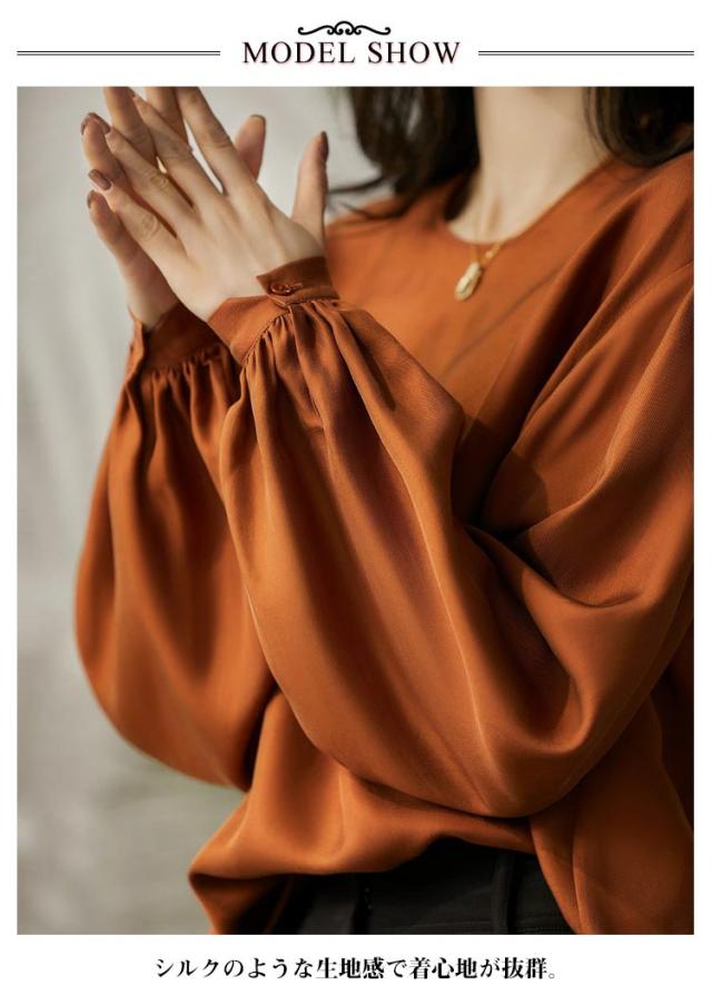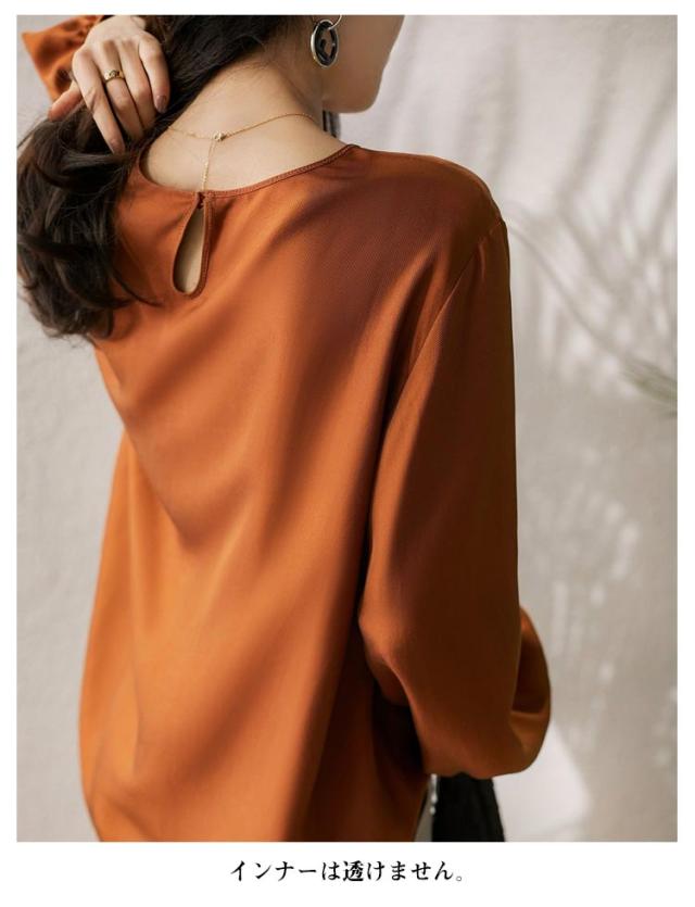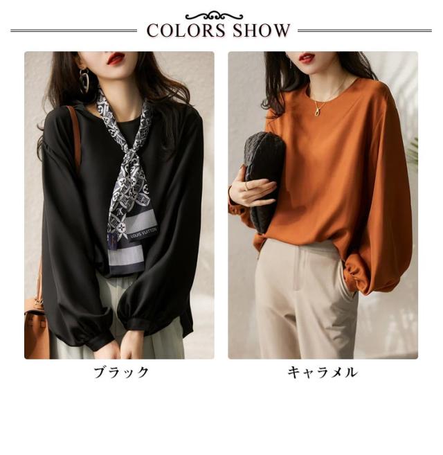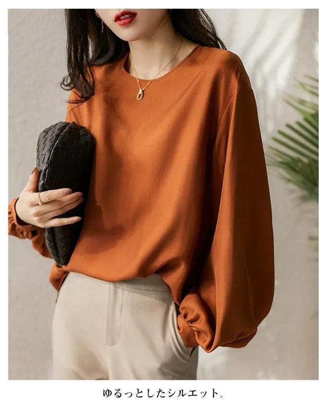 | シルクのような生地感で着心地が抜群。 ゆるっとしたシルエット。 インナーは透けません。 オフィス・フォーマルシーンはもちろん、カジュアル・デートシーンにもピッタリなブラウス | |